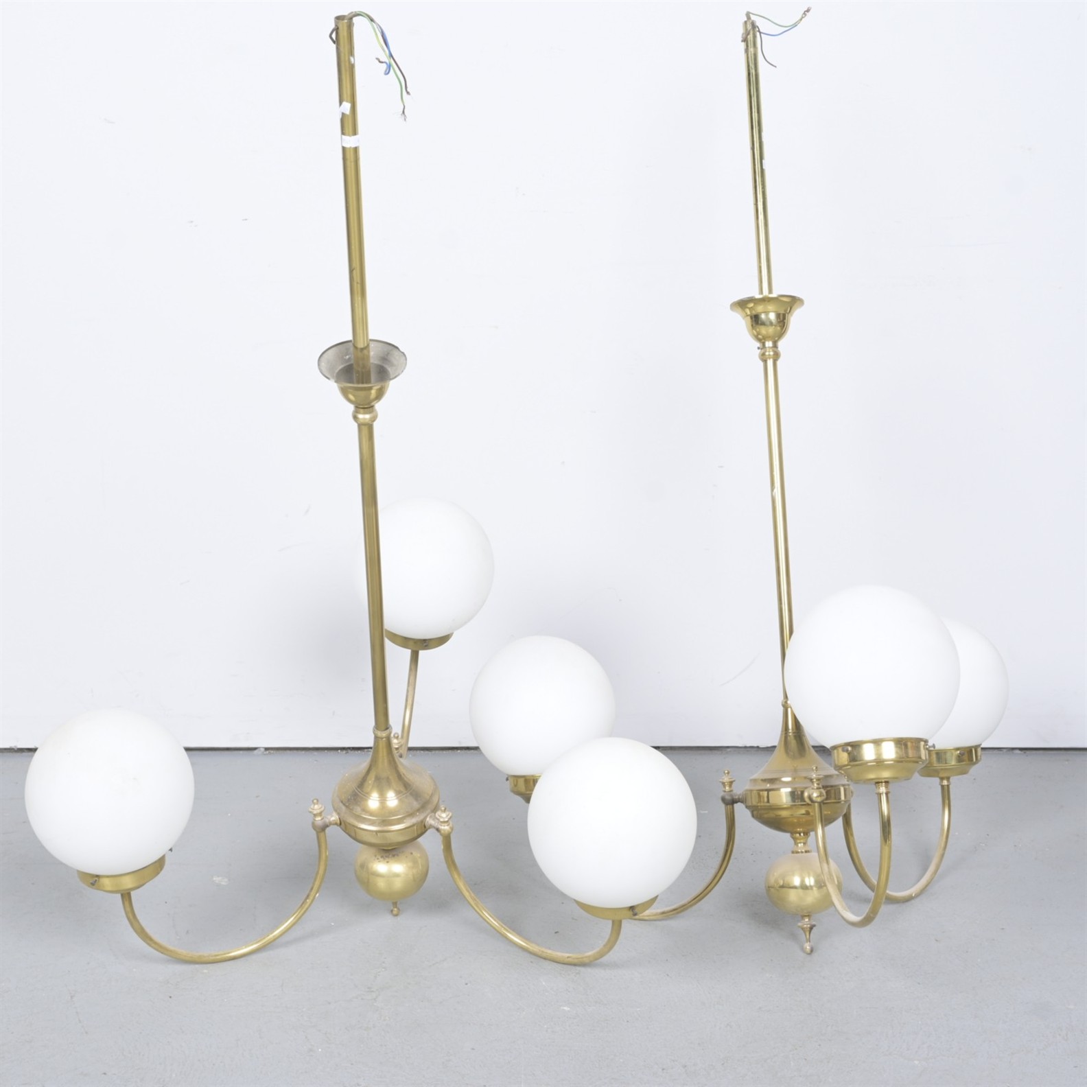 A PAIR OF BRASS AND GLASS CHANDELIERS (127H X 80W CM)