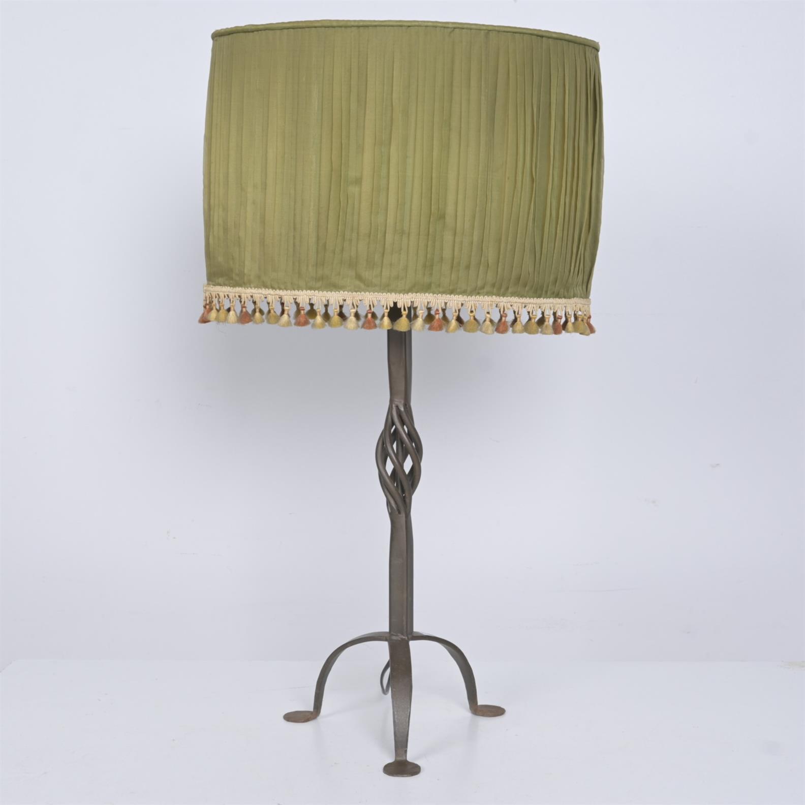 A WROUGHT IRON TABLE LAMP WITH PLEATED SHADE (84H X 54D CM)