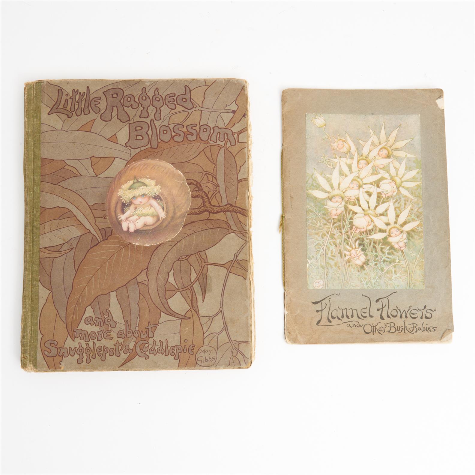 TWO EARLY EDITIONS OF BOOKS BY MAY GIBBS INCLUDING FLANNEL FLOWERS, AND LITTLE RAGGED BLOSSOM (LITTLE RAGGED BLOSSOM WITH HAND WRITTEN NOTE DATED 1920, BOTH BOOKS A/F) 24.5CM (LARGEST)
