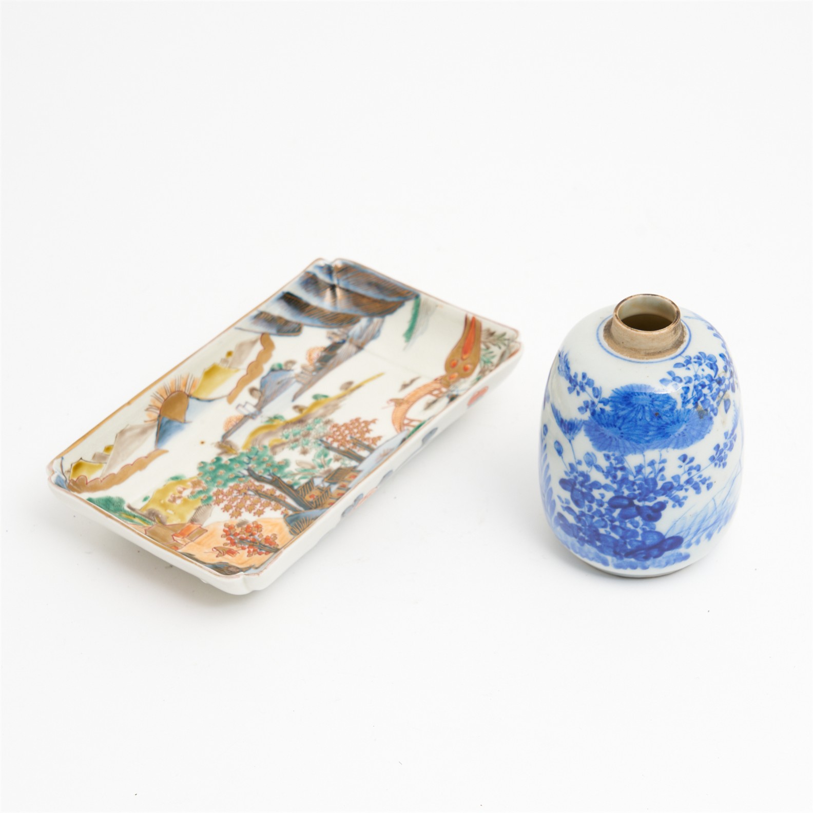 TWO PIECES OF JAPANESE PORCELAIN INCLUDING AN EXPORT DISH AND A BLUE AND WHITE TEA CADDY (MISSING COVER) L.19.5CM