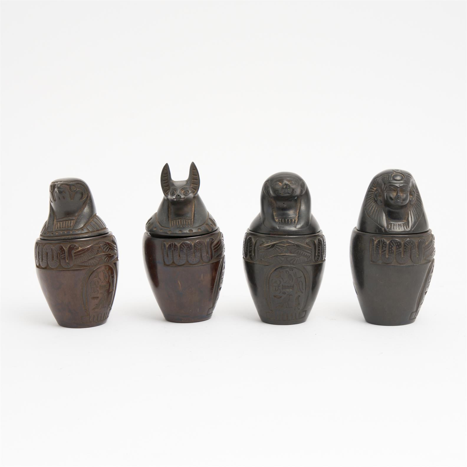 FOUR EGYPTIAN CARVED STONE CANOPIC VESSELS H.13CM (TALLEST)