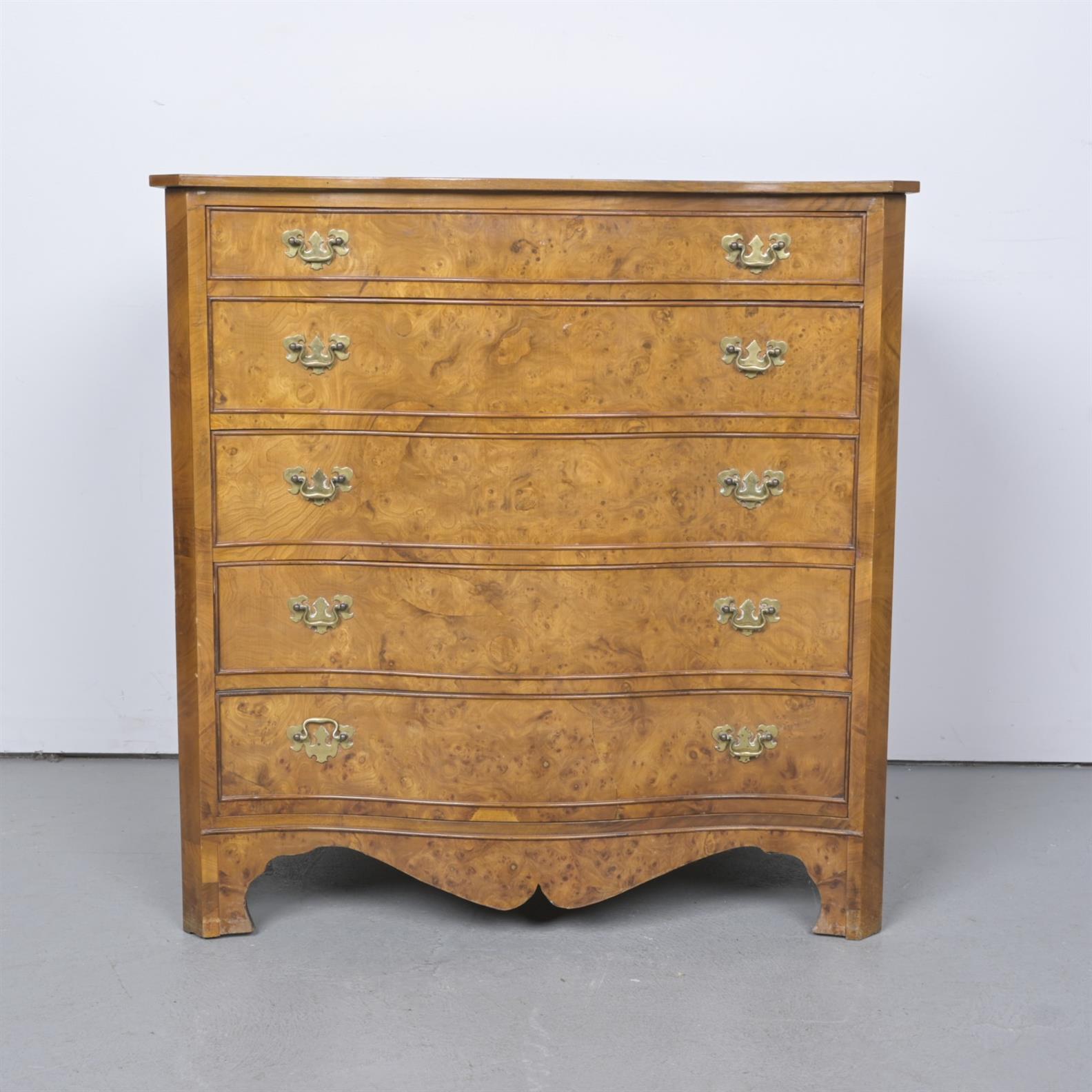 A BURR WALNUT CHEST OF DRAWERS IN SHERATON REVIVAL MANNER (92H X 89W X 52D CM) (THIS ITEM MUST BE REMOVED BY CARRIERS AT THE CUSTOMER'S EXPENSE. LEONARD JOEL STAFF CANNOT ASSIST CARRYING THIS ITEM)