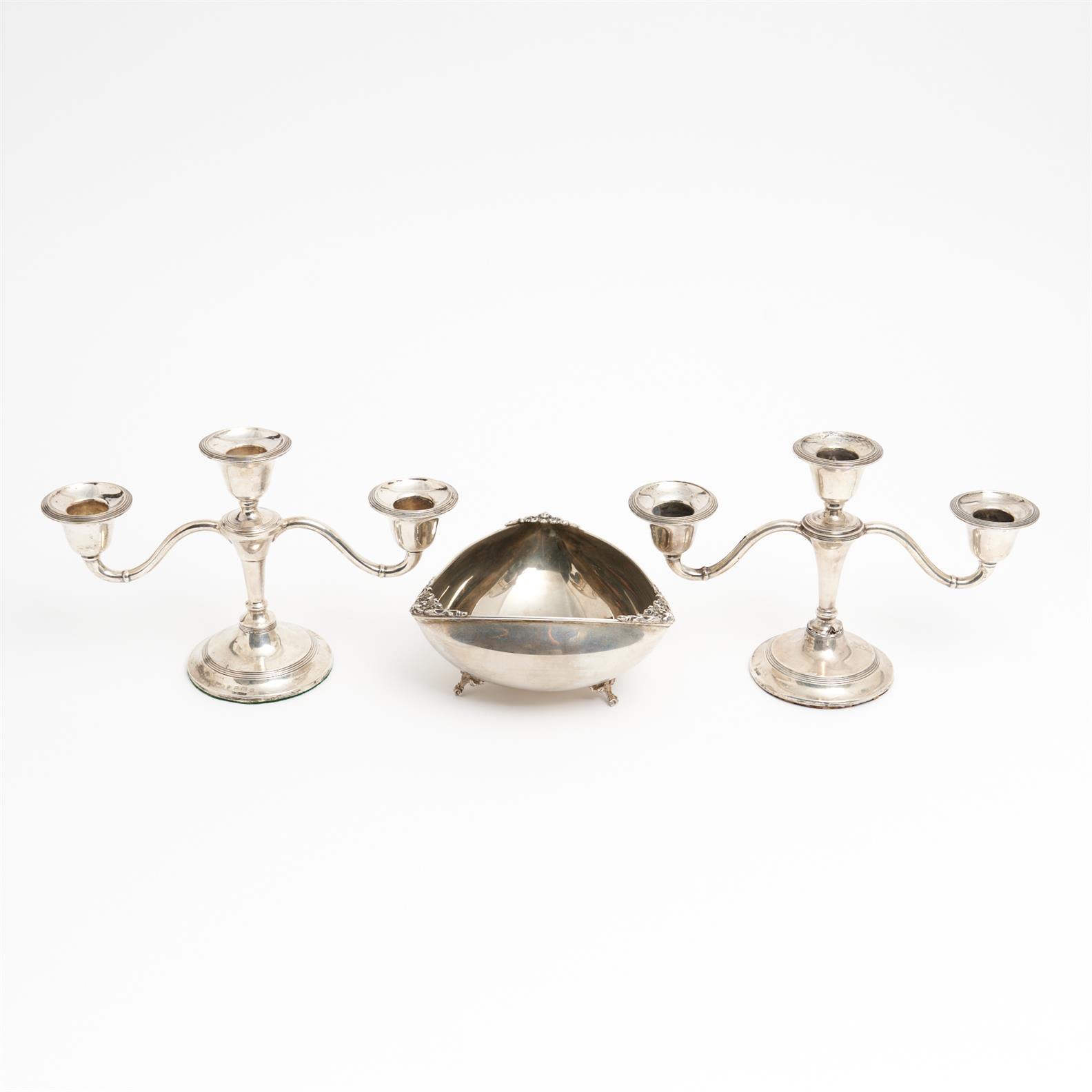 A PAIR OF STERLING SILVER CANDLESTICKS AND A SILVER PLATE BOWL H.15CM (CANDLE STICKS A/F) (16G BOWL)