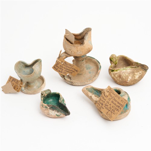 A COLLECTION OF FIVE ANTIQUE PERSIAN POTTERY LAMPS (A/F) H.12CM (TALLEST)