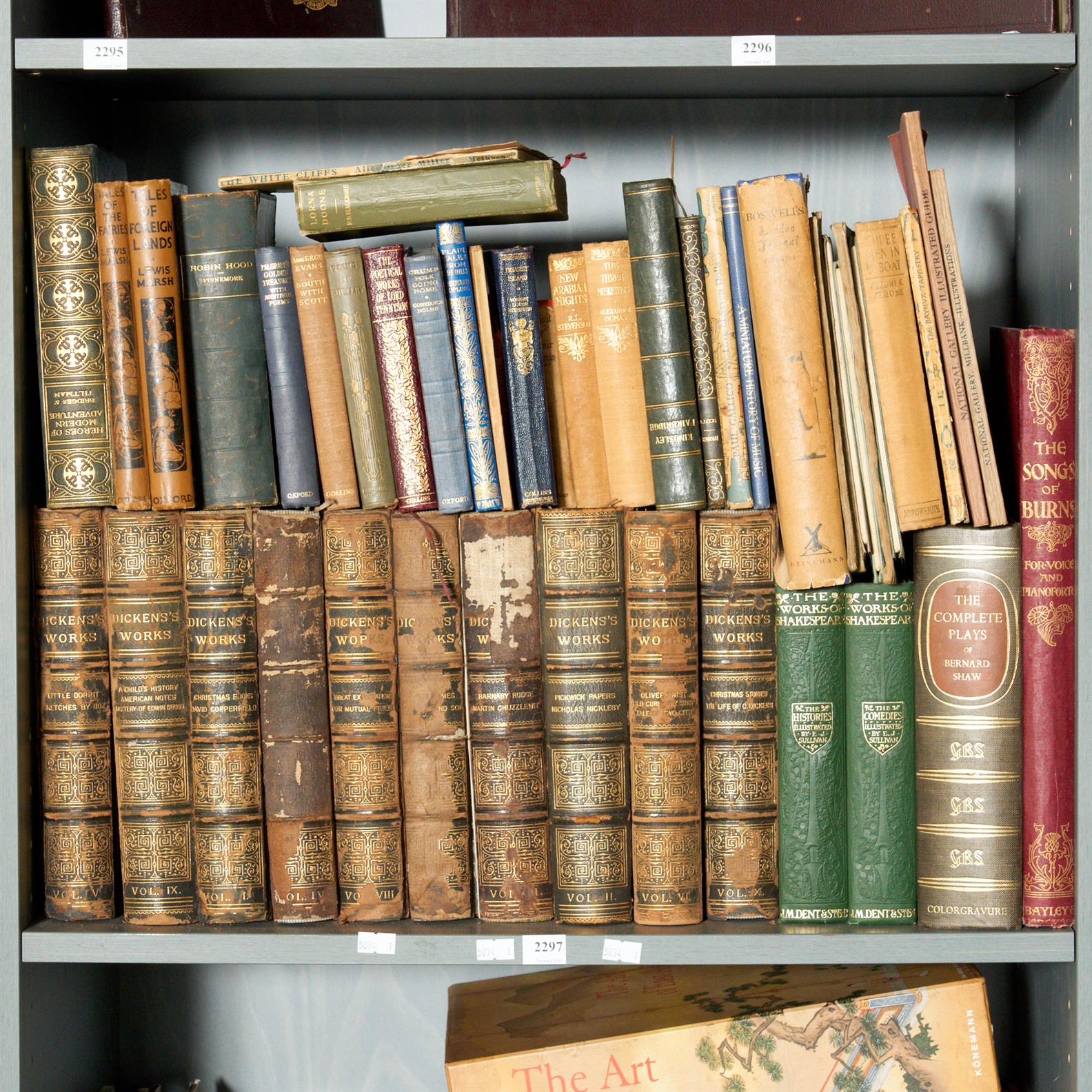 A SHELF OF DECORATIVE BINDINGS INCLUDING A COLLECTION OF CHARLES DICKENS BOOKS (A/F)