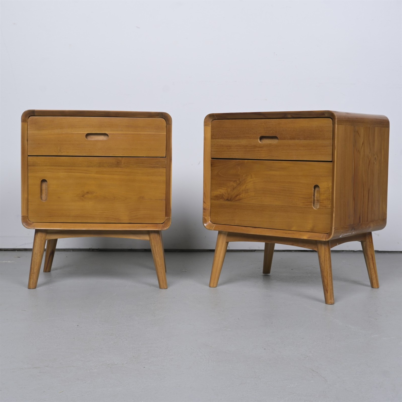 A PAIR OF TEAK MID-20th CENTURY-STYLE BEDSIDE CABINETS (60H X 50W X 41D CM)