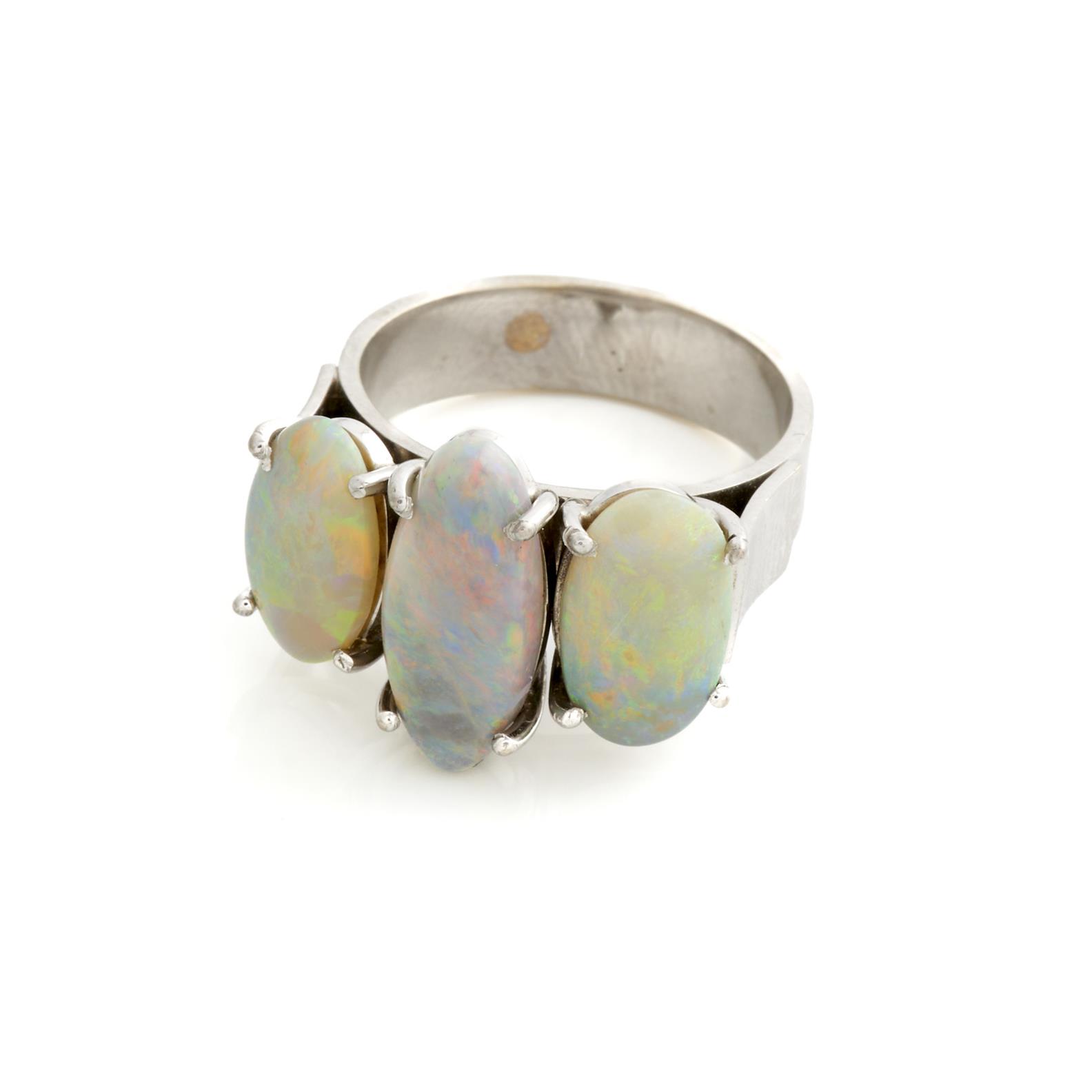 AN OPAL RING IN 9CT WHITE GOLD, SIZE N, 7.1GMS