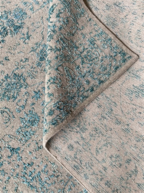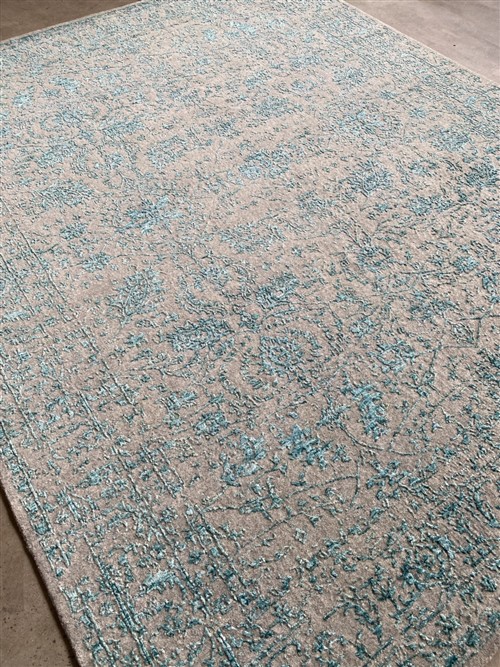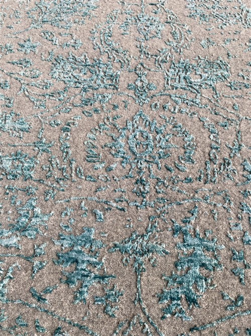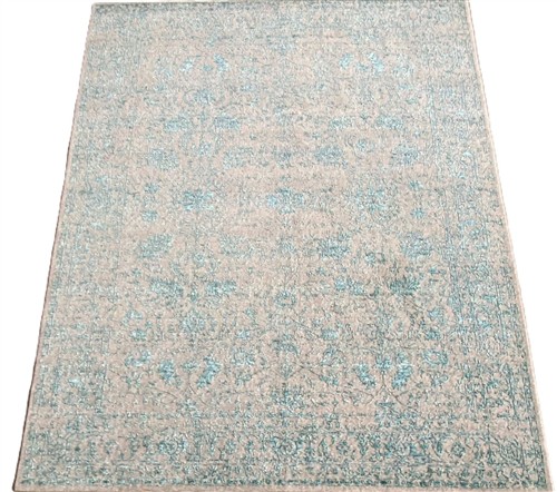 HAND-WOVEN LOOM KNOT. WOOL & SILK TEXTURE PILE. TRANSITIONAL DESIGN OF ALL-OVER ERASED & EMBOSSED PALMETTES & FLORAL PATTERNS IN SHADES OF SILVER & BLUE.