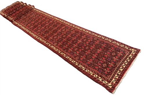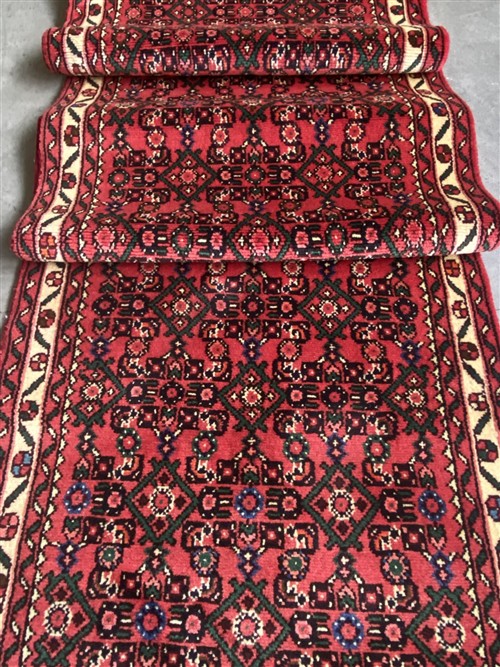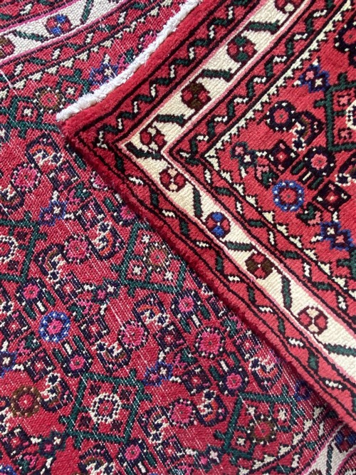 100% WOOLEN PILE. SOLID HAND-KNOTTED VILLAGE WEAVE FROM THE HAMADAN PROVINCE WITH TRIBAL DESIGN OF ALL-OVER BOLD HERATI MAHI MOTIFS. BORDER OF FLOWER HEADS. THE ENTIRE IN SHADES OF RED, CHARCOAL, GREEN & CREAM.