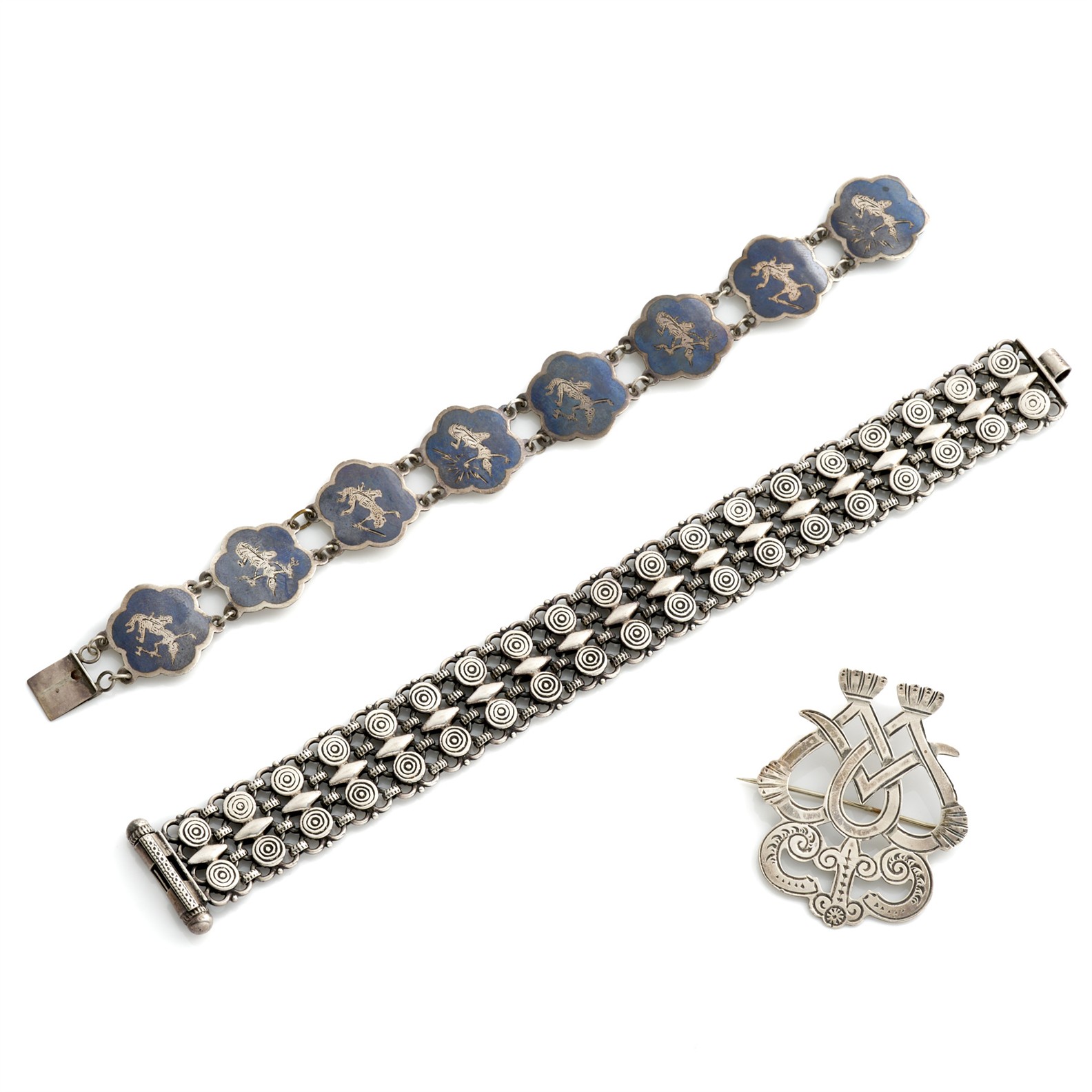 A PAIR OF BRACELETS AND BROOCH IN STERLING SILVER, THE BRACELETS MEASURING 200MM, THE BROOCH 50MM X 40MM
