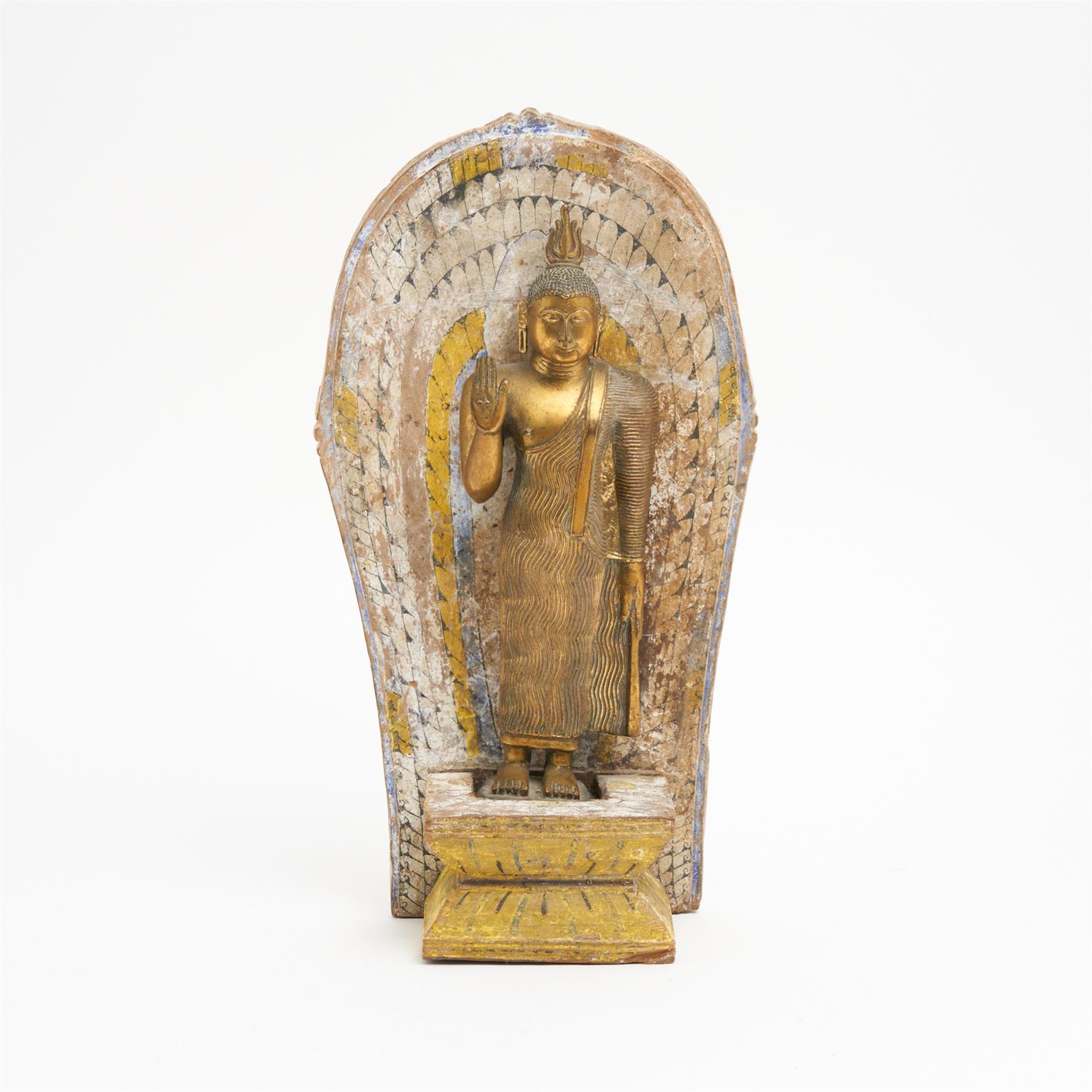 A SRI LANKAN GILDED BRONZE STANDING BUDDHA ON POLYCHROME WOODEN BASE, 20TH CENTURY H.34CM