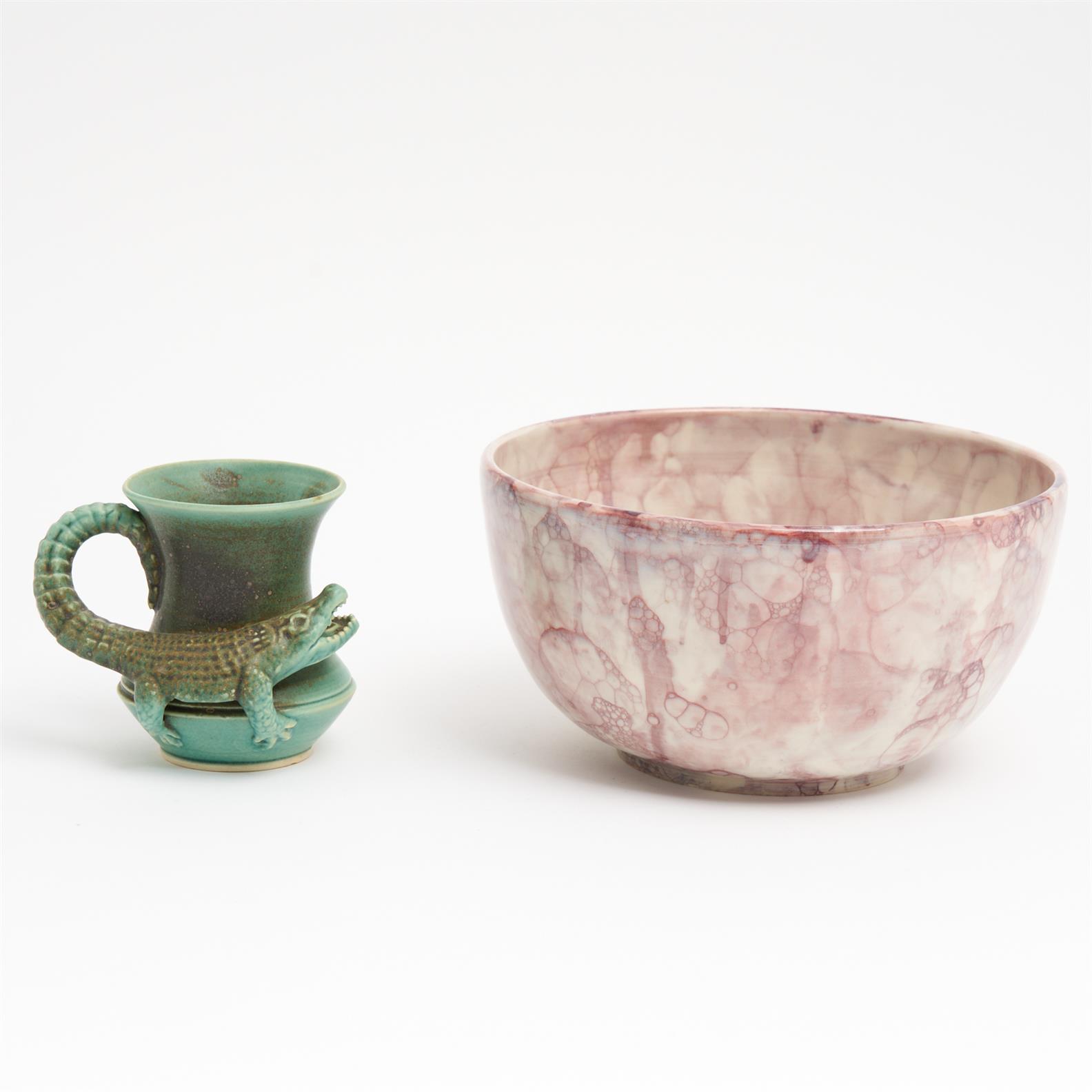 TWO PIECES OF STUDIO POTTERY INCLUDING A HELLFIRE POTTERY CROCODILE STEIN AND A CRYSTALLINE GLAZED BOWL DIA.22.5CM (LARGEST)