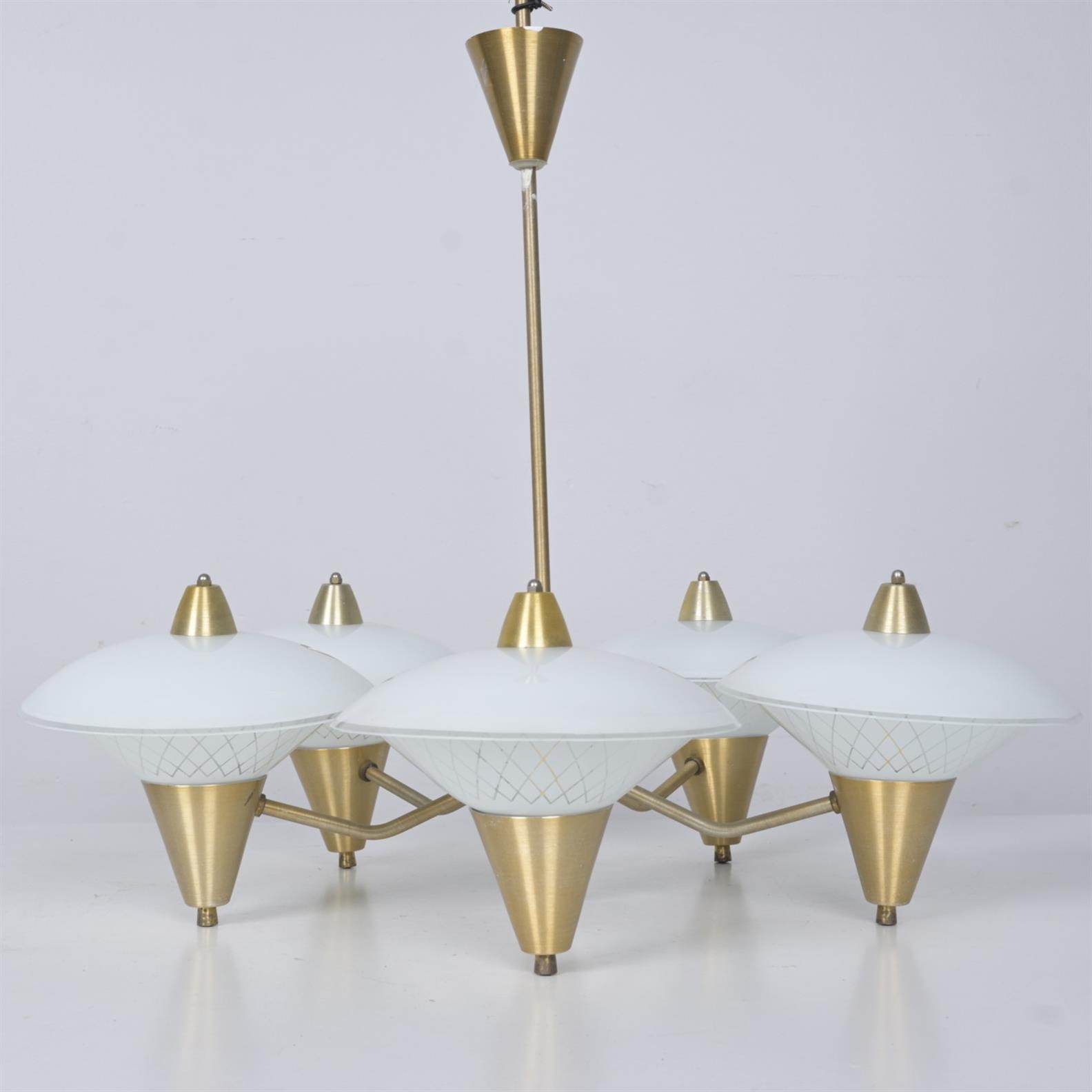A MID-20th CENTURY FIVE ARM ETCHED GLASS CHANDELIER (60H X 60W CM)