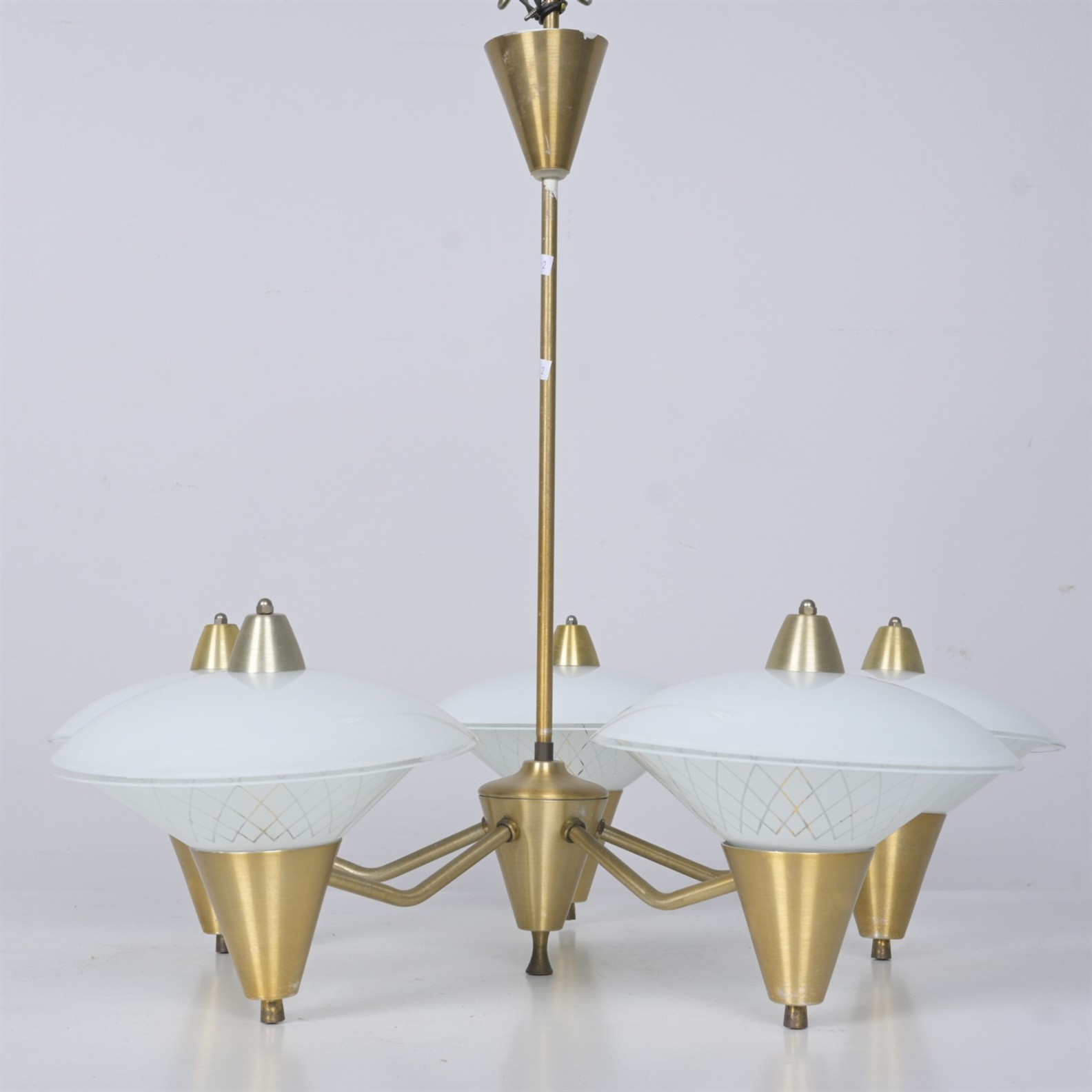 A MID-20th CENTURY FIVE ARM ETCHED GLASS CHANDELIER (60H X 60W CM)