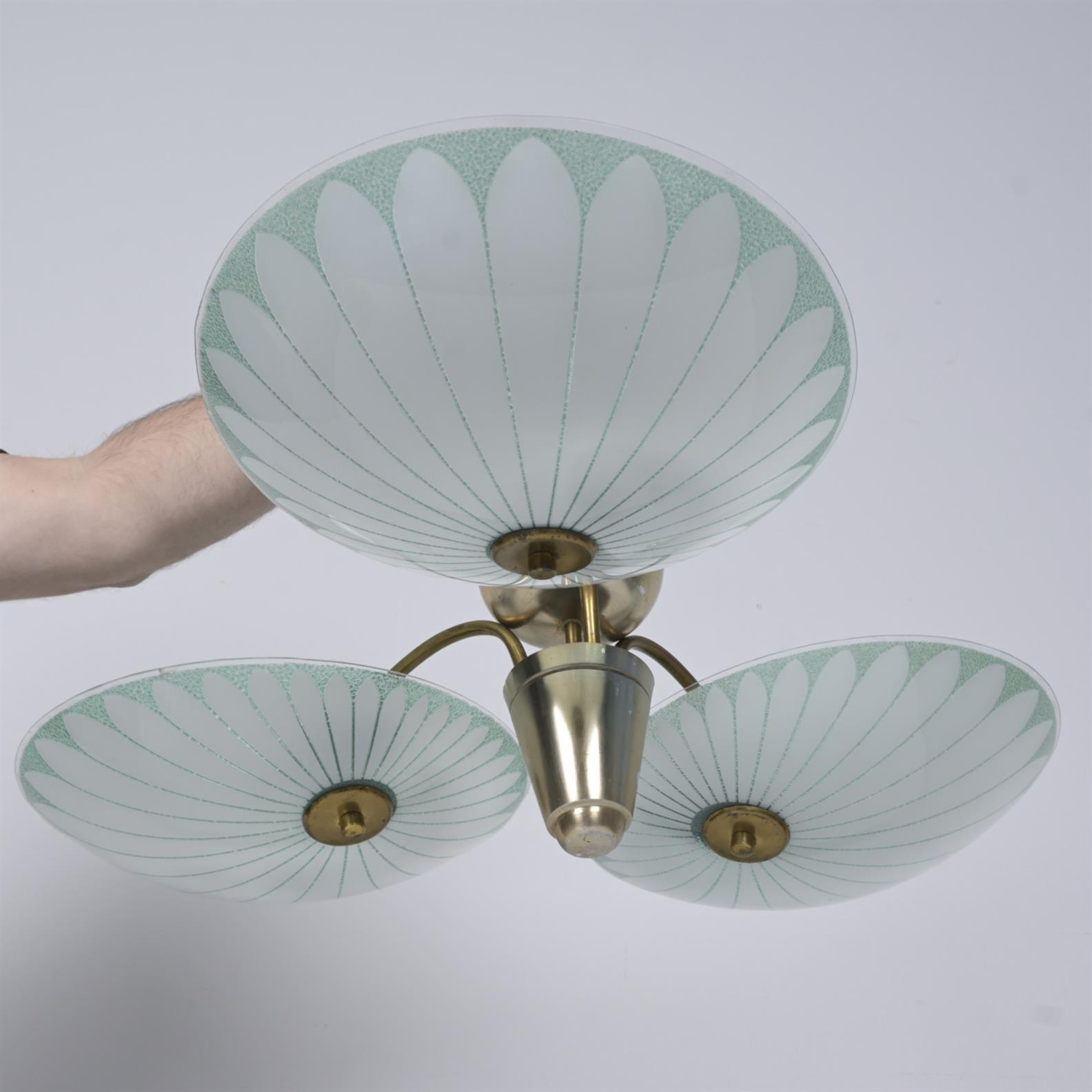 A MID-20th CENTURY THREE ARM ETCHED GLASS CHANDELIER (49DROP X 60D CM)