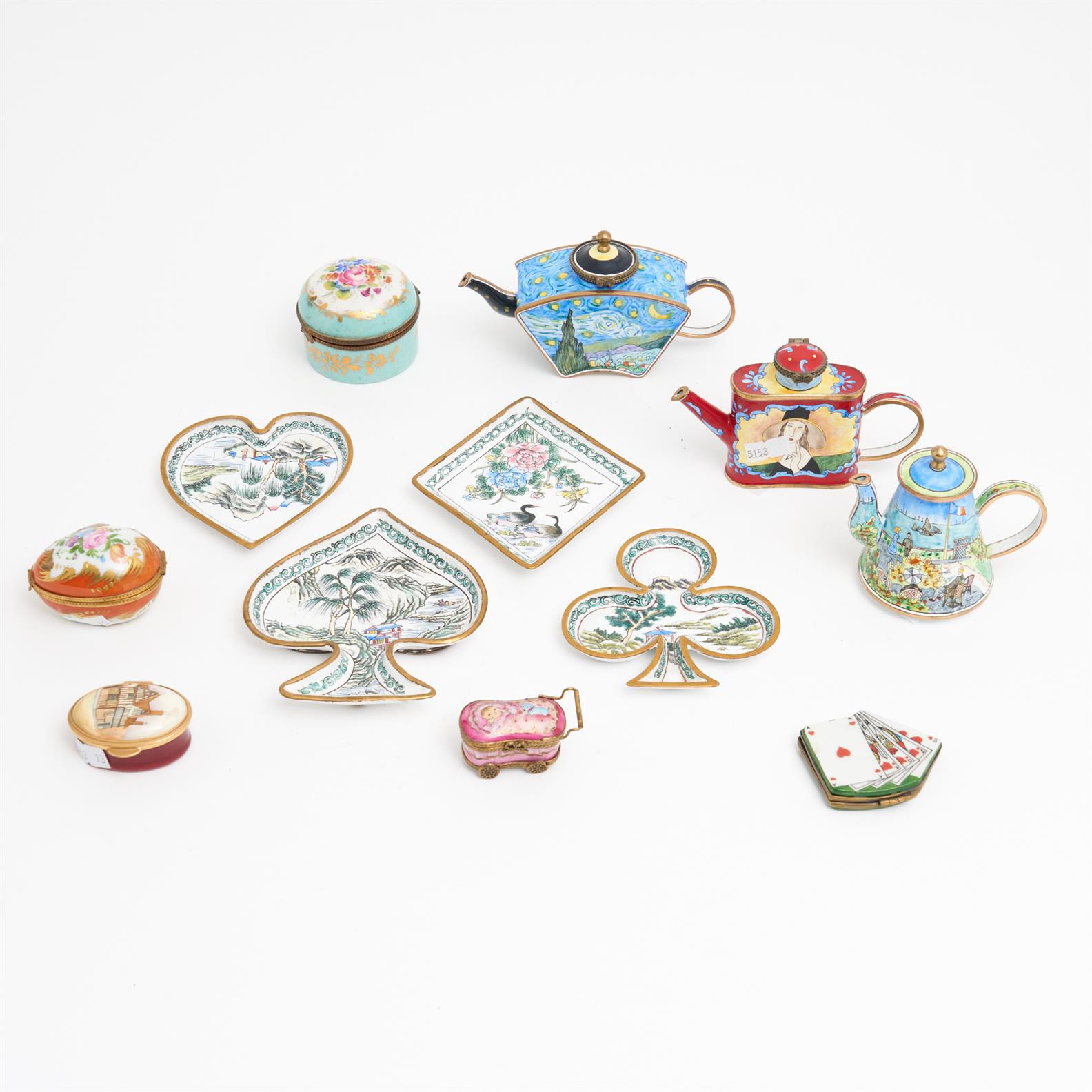 A COLLECTION OF ENAMELED METAL OBJECTS INCLUDING THREE KELVIN CHEN TEAPOTS, LIMOGES BOXES, AND VARIOUS DISHES L.13.5CM (LARGEST)