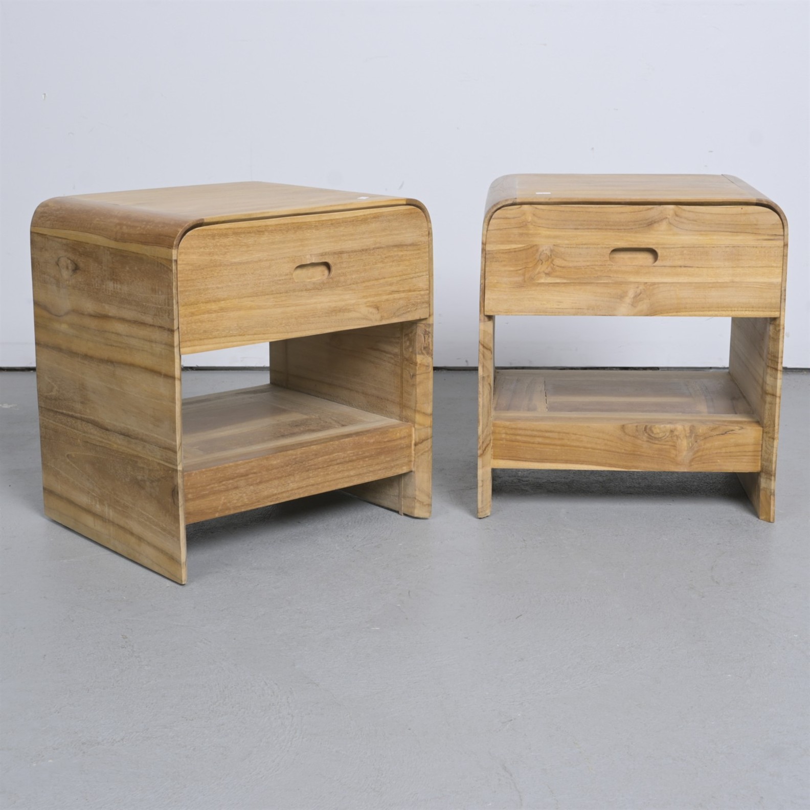 A PAIR OF TEAK BEDSIDE TABLES (48H X 45W X 40D CM)