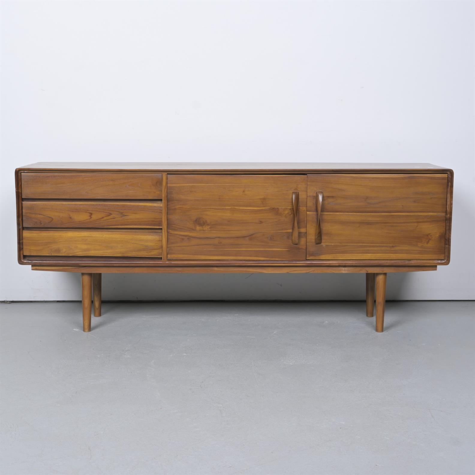 A TEAK SIDEBOARD IN MID-20th CENTURY-STYLE (71H X 181W X 41D CM) (THIS ITEM MUST BE REMOVED BY CARRIERS AT THE CUSTOMER'S EXPENSE. LEONARD JOEL STAFF CANNOT ASSIST CARRYING THIS ITEM)