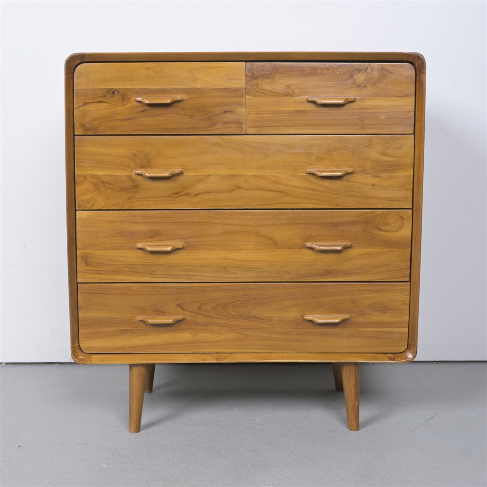 A CONTEMPORARY TEAK CHEST OF DRAWERS (A/F) (97 X 91 X 45D CM) (THIS ITEM MUST BE REMOVED BY CARRIERS AT THE CUSTOMER'S EXPENSE. LEONARD JOEL STAFF CANNOT ASSIST CARRYING THIS ITEM)