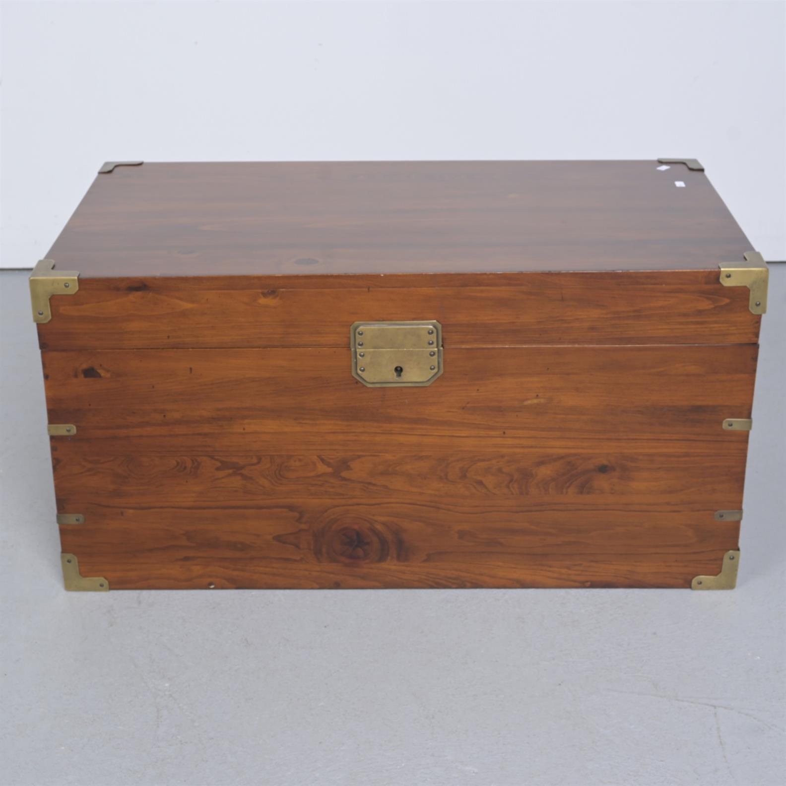 A PINE TRUNK WITH BRASS CORNERS AND CARRY HANDLES (46H X 91W X 50D CM)