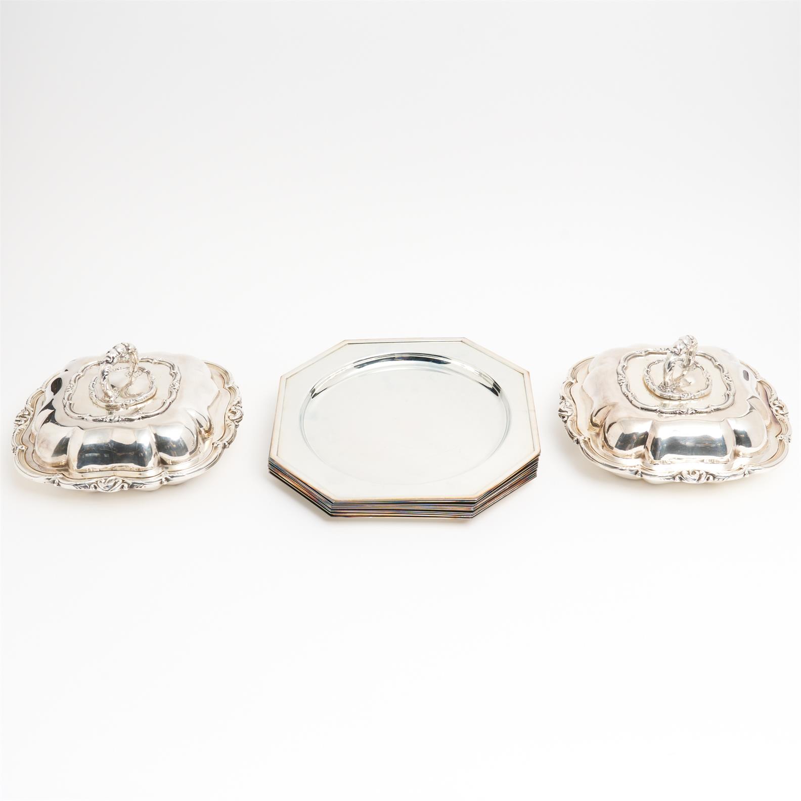A SET OF SILVER PLATE DINNER PLATES ALL WITH FELT SLEEVES TOGETHER WITH A PAIR OF DECORATIVE SILVER PLATE TUREENS DIA.29.5CM (LARGEST)
