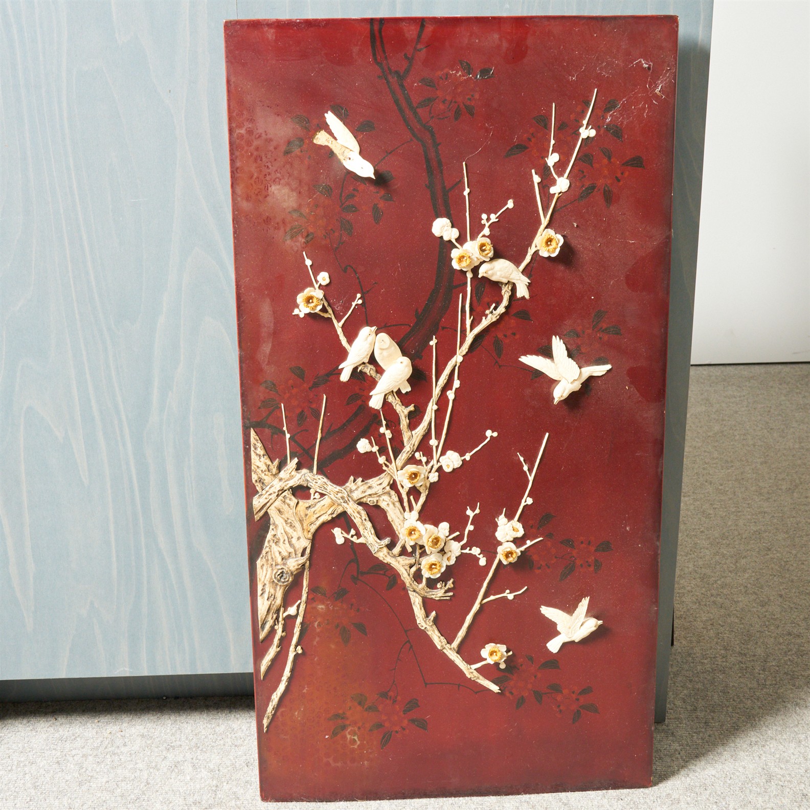 A JAPANESE 19TH CENTURY SHIBAYAMA PANEL WITH CARVED BONE BIRDS AMID BLOSSOMING FOLIAGE (A/F, MISSING PIECES) 91 X 48CM