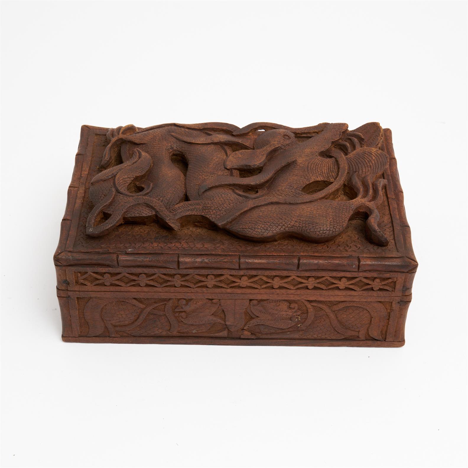 A TEAK BOX WITH CARVED DRAGON DECORATION W.23CM
