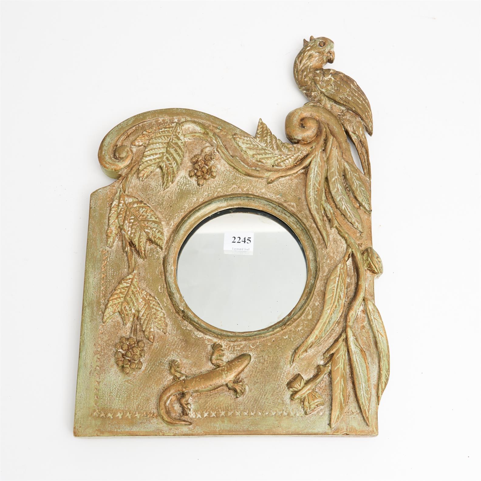 AN ANTIQUE AUSTRALIAN CARVED AND GILDED BLACKWOOD LIZARD AND BIRD DECORATED MIRROR H.27CM