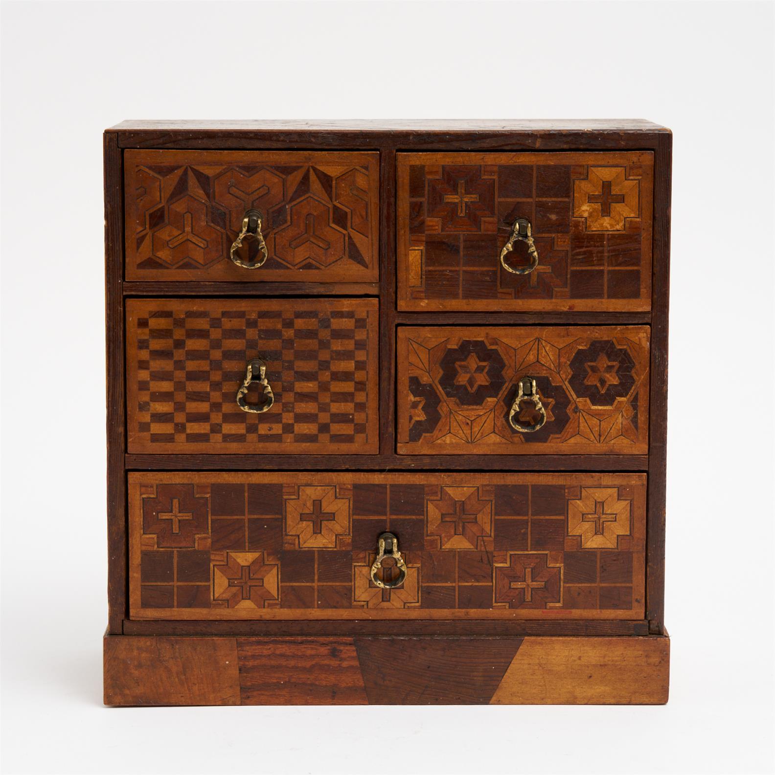 AN ENGLISH TUNBRIDGE WARE FIVE DRAWER MINIATURE CHEST WITH BRASS HANDLES W.23.5CM