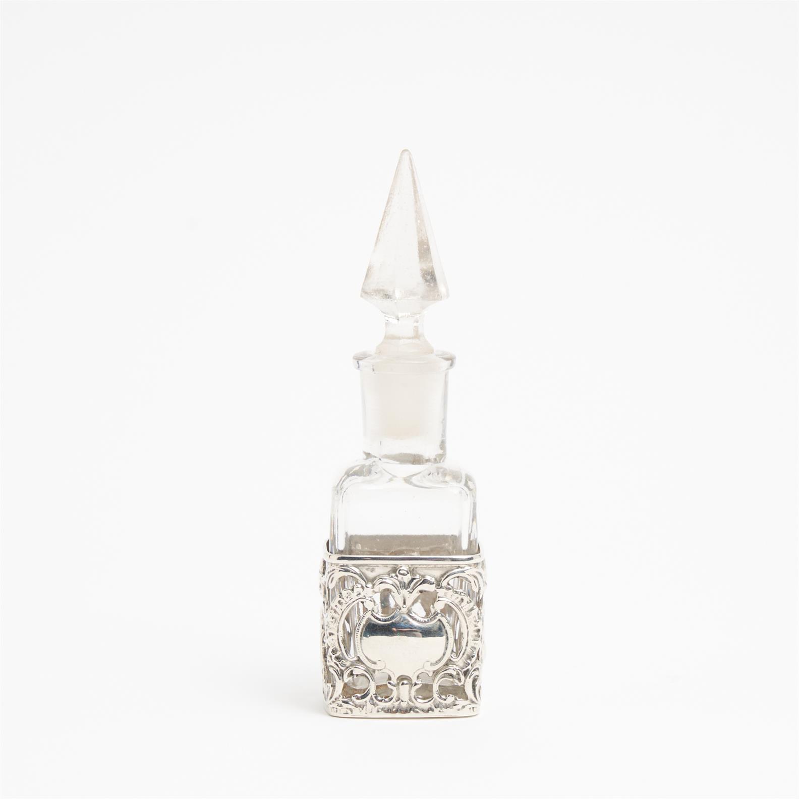 A STERLING SILVER MOUNTED CRYSTAL PERFUME BOTTLE WITH CHERUB DECORATION (A/F) H.14CM