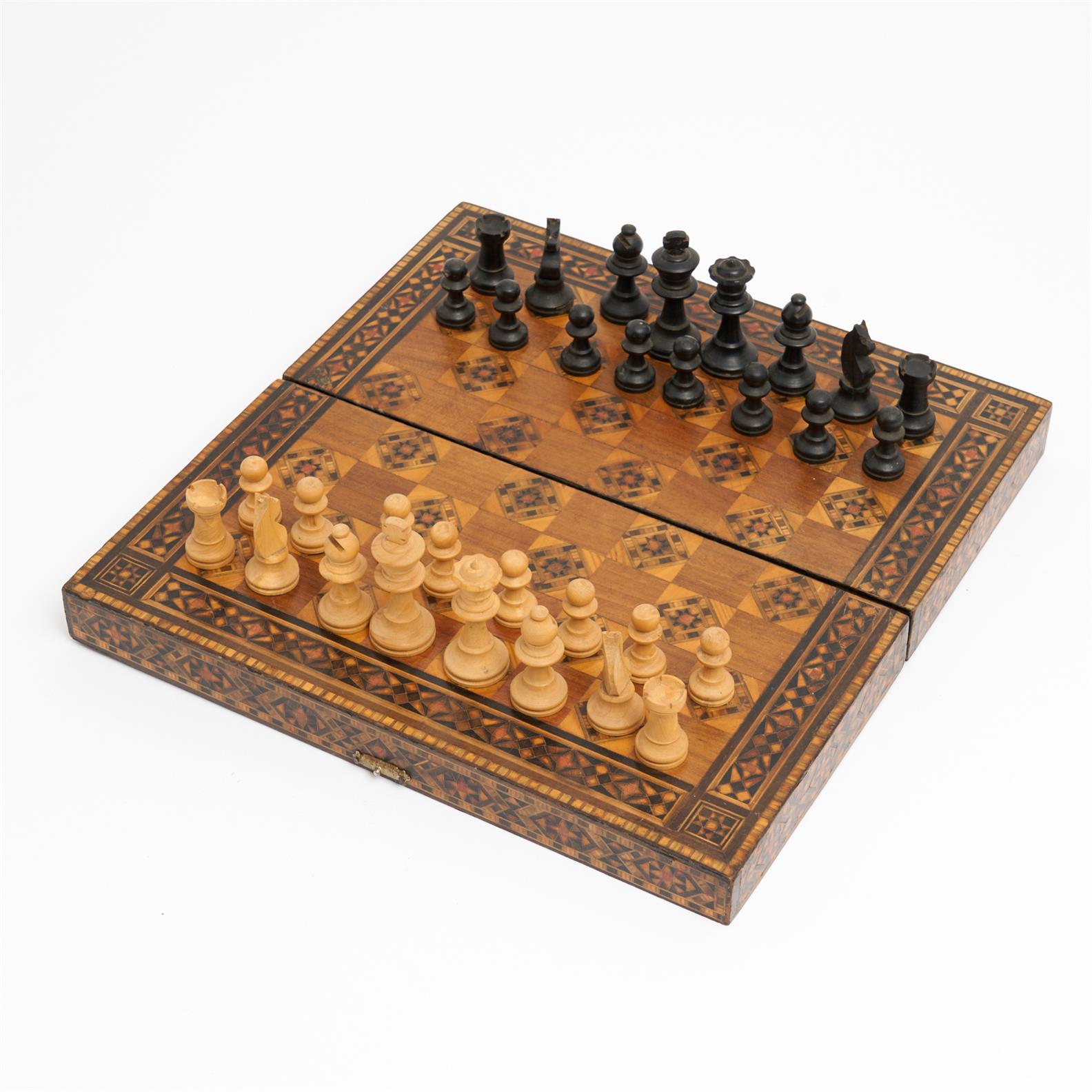 AN INLAID CHESS AND BACKGAMMON SET WITH BOXWOOD AND EBONY CHESS PIECES W.30CM (BOARD)