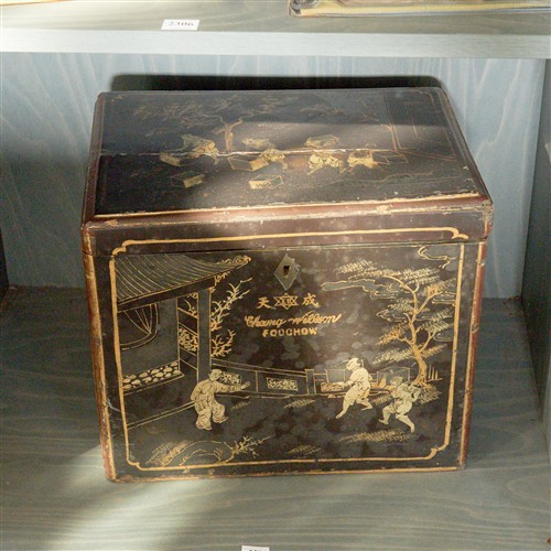 A CHINESE HANDPAINTED AND LACQUERED TEA BOX WITH ORIGINAL METAL HANDLES AND NAME TO FRONT (A/F) W.36CM