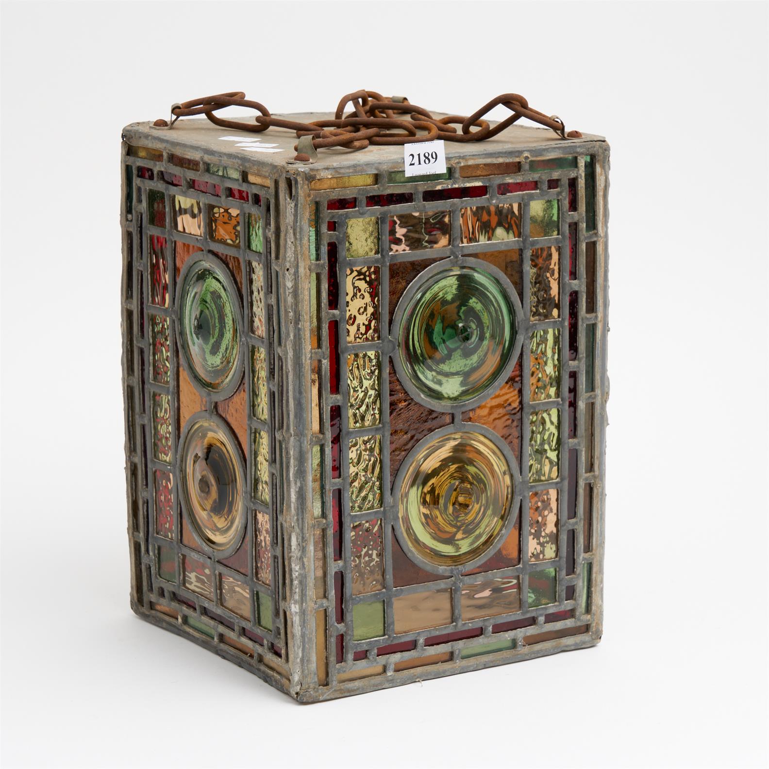 A 19TH CENTURY ENGLISH STAINED GLASS SQUARE FORM CEILING SHADE H.29CM