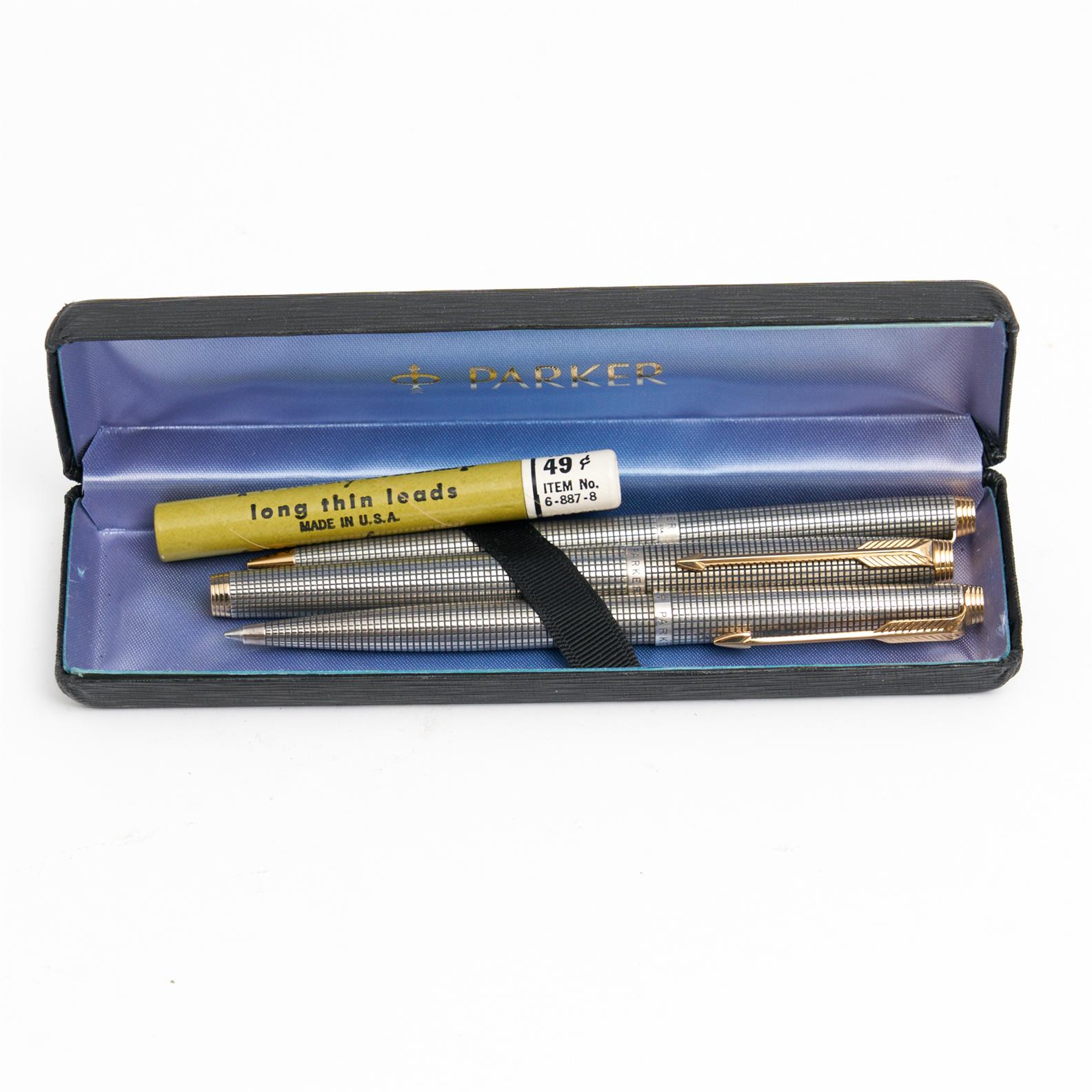 A PARKER 75 CICELE STERLING SILVER FOUNTAIN PEN, BIRO AND PROPELLING PENCIL, IN BOX