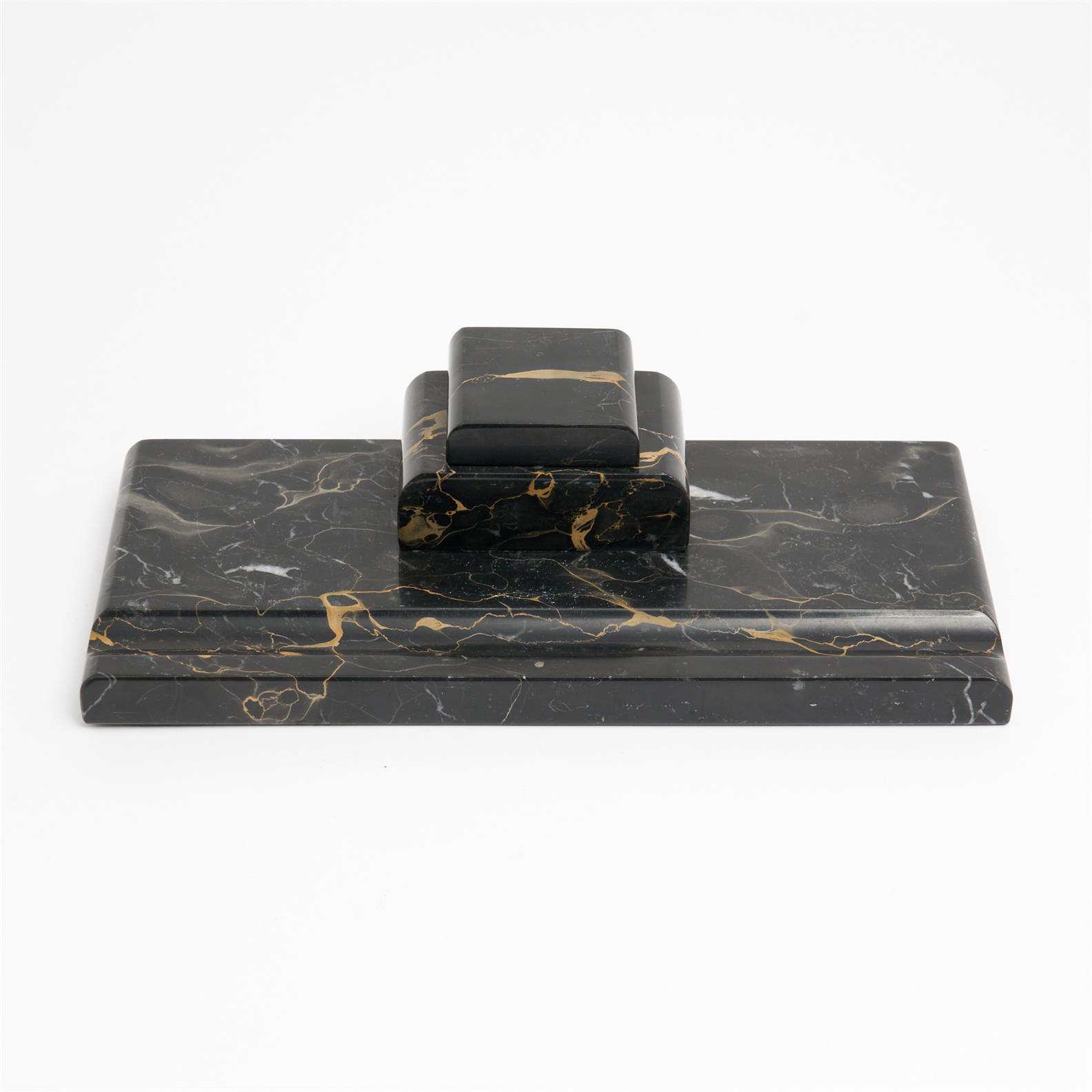 A BLACK MARBLE INKWELL DESK SET WITH CERAMIC WELL W.32CM