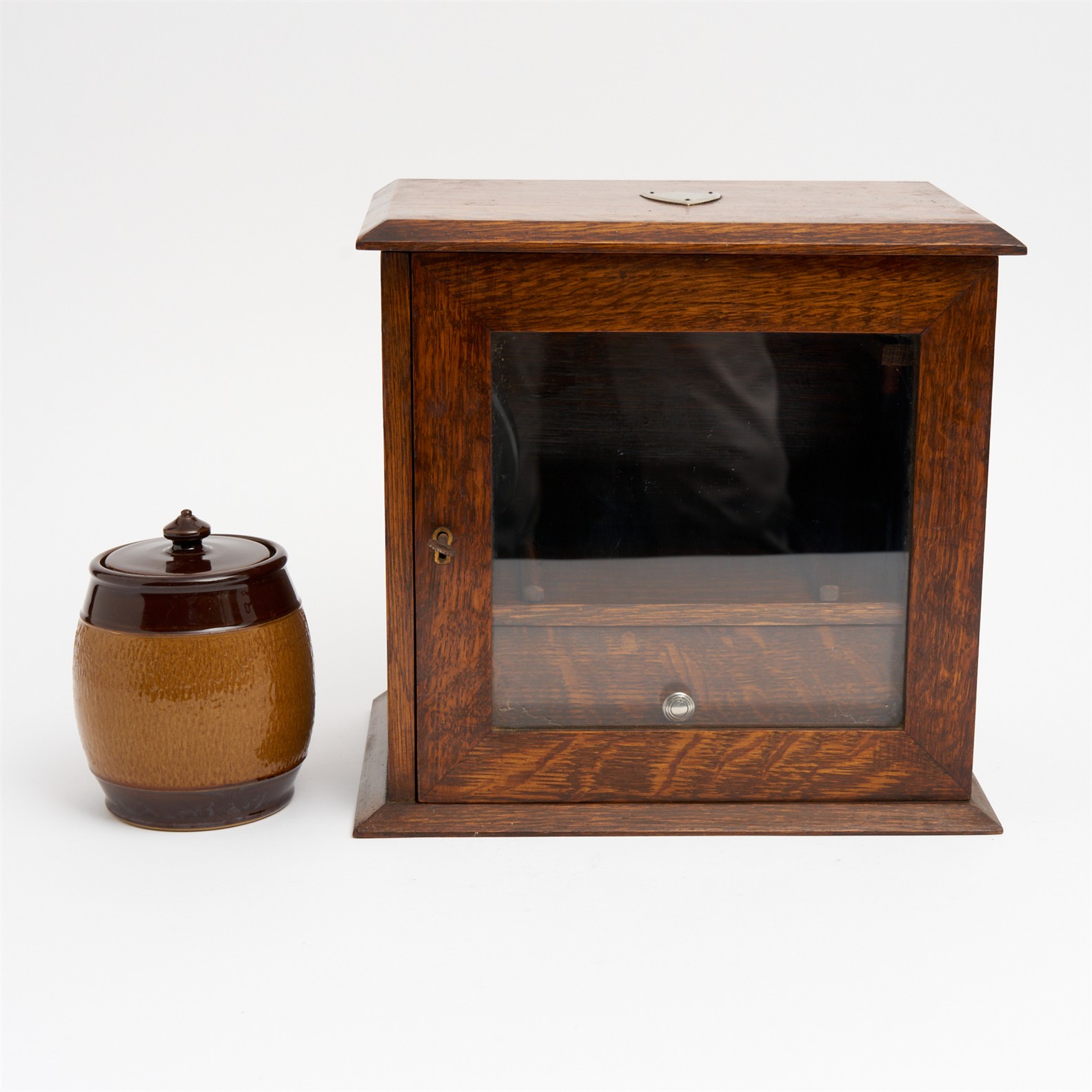 AN ENGLISH OAK AND GLASS FRONTED HUMIDOR H.27CM