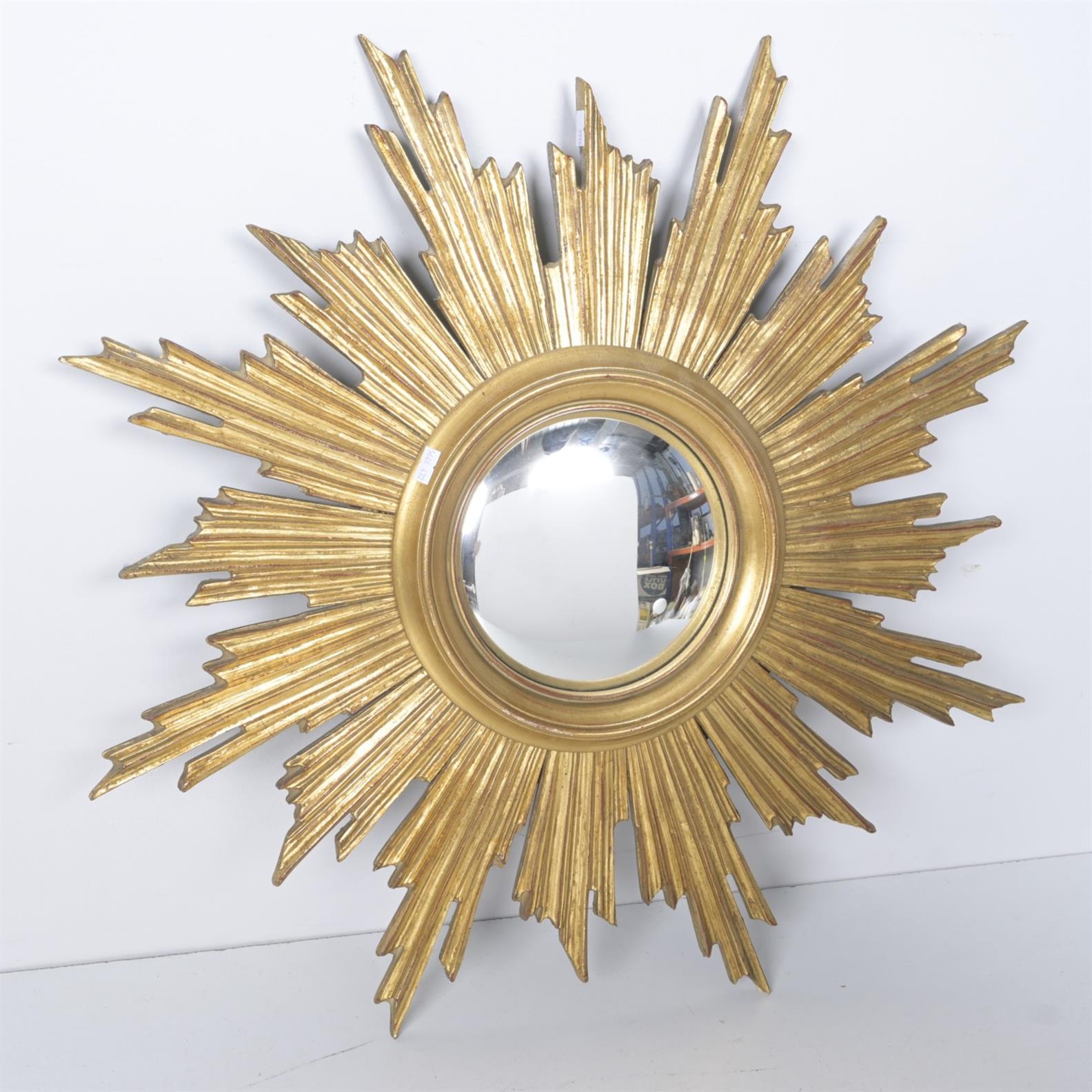 A FRENCH CARVED GILTWOOD SUNBURST WALL MIRROR (65H X 70D CM)