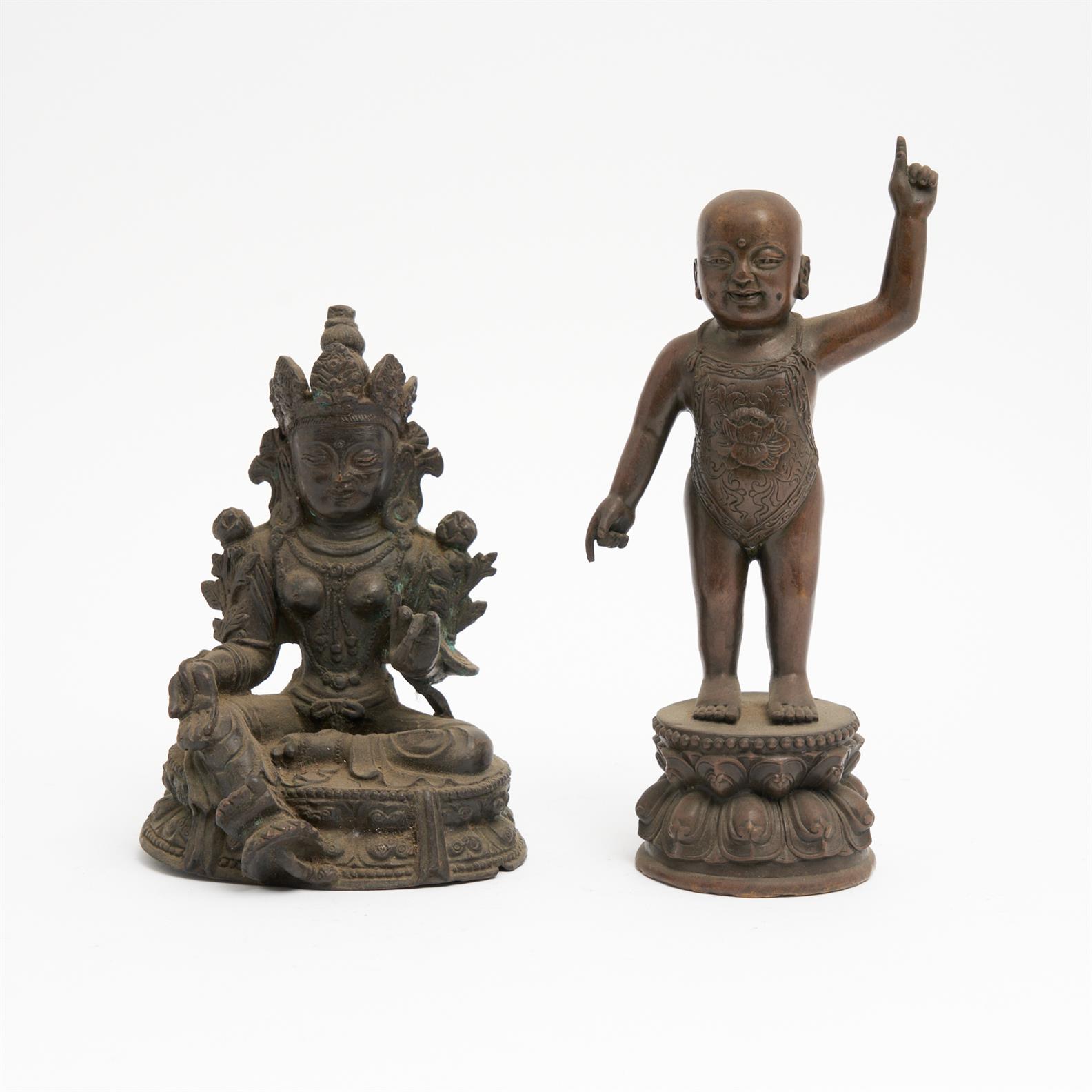 A CHINESE MING BRONZE SEATED FIGURE OF TARA, TOGETHER WITH A LATER BRONZE FIGURE OF SHAKYAMUNI, STANDING UPON LOTUS BASE H.29CM (TALLEST)