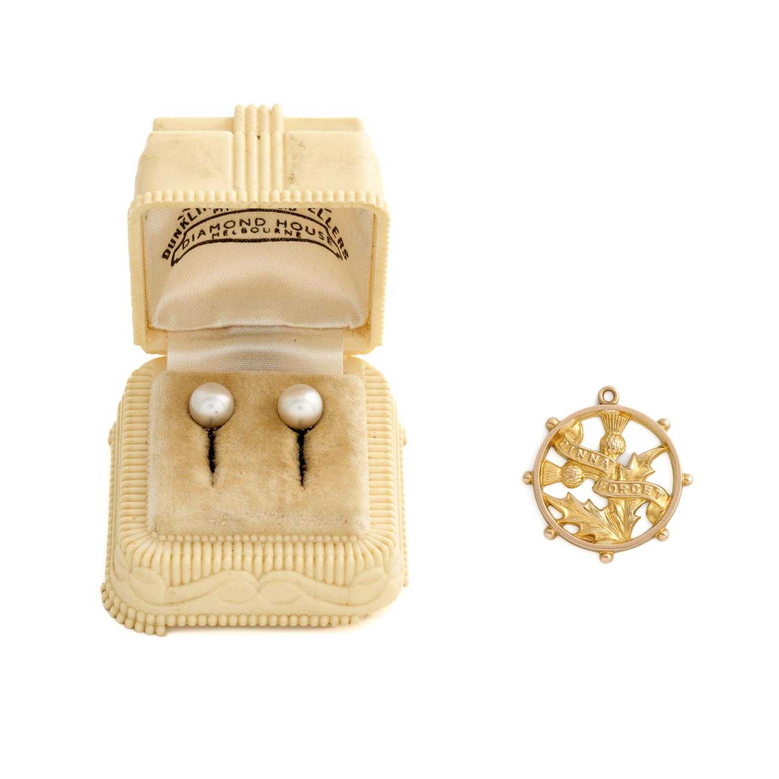 WILLIS BROTHERS, AN AUSTRALIAN 'DINNA FORGET' PENDANT IN 9CT GOLD, 1.3GMS, TOGETHER WITH A PAIR OF PEARL EARRINGS TO SCREWBACK FITTINGS