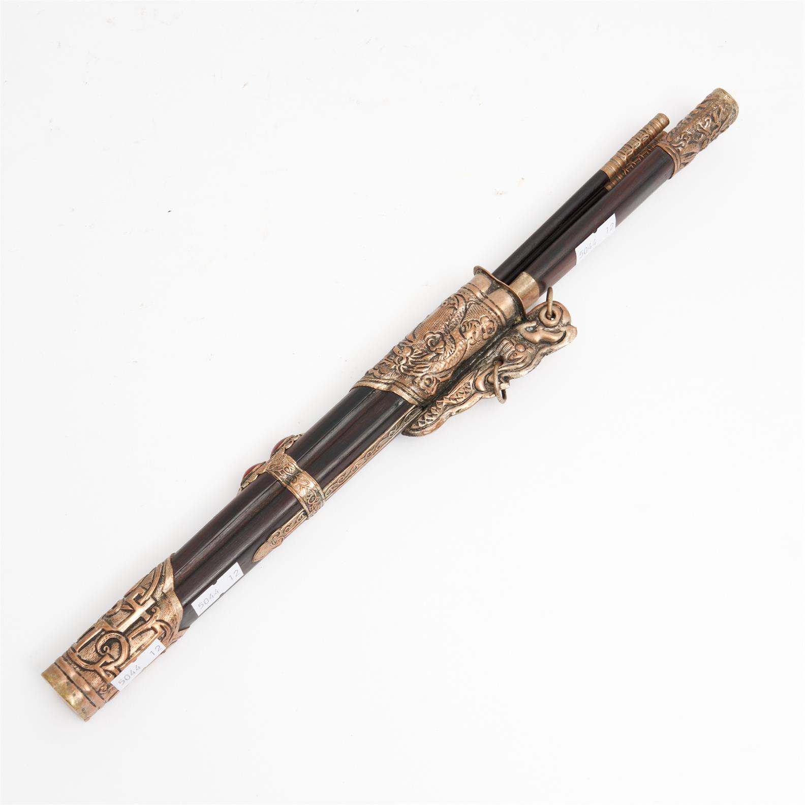 A METAL BOUND CHINESE TRAVELLING IMPLEMENT SET WITH KNIFE AND CHOPSTICKS L.34CM