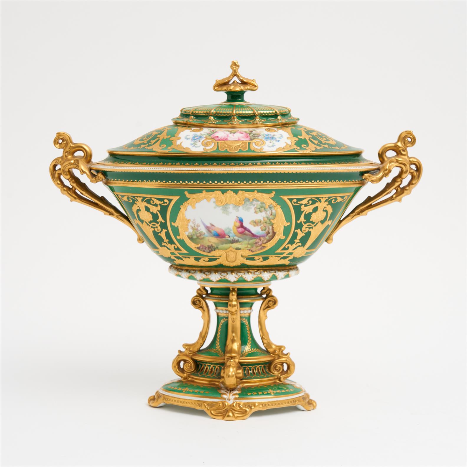 A ROYAL CROWN DERBY HAND PAINTED AND GILDED COMPORT AND COVER, SIGNED 'DARTINGTON' H.30CM