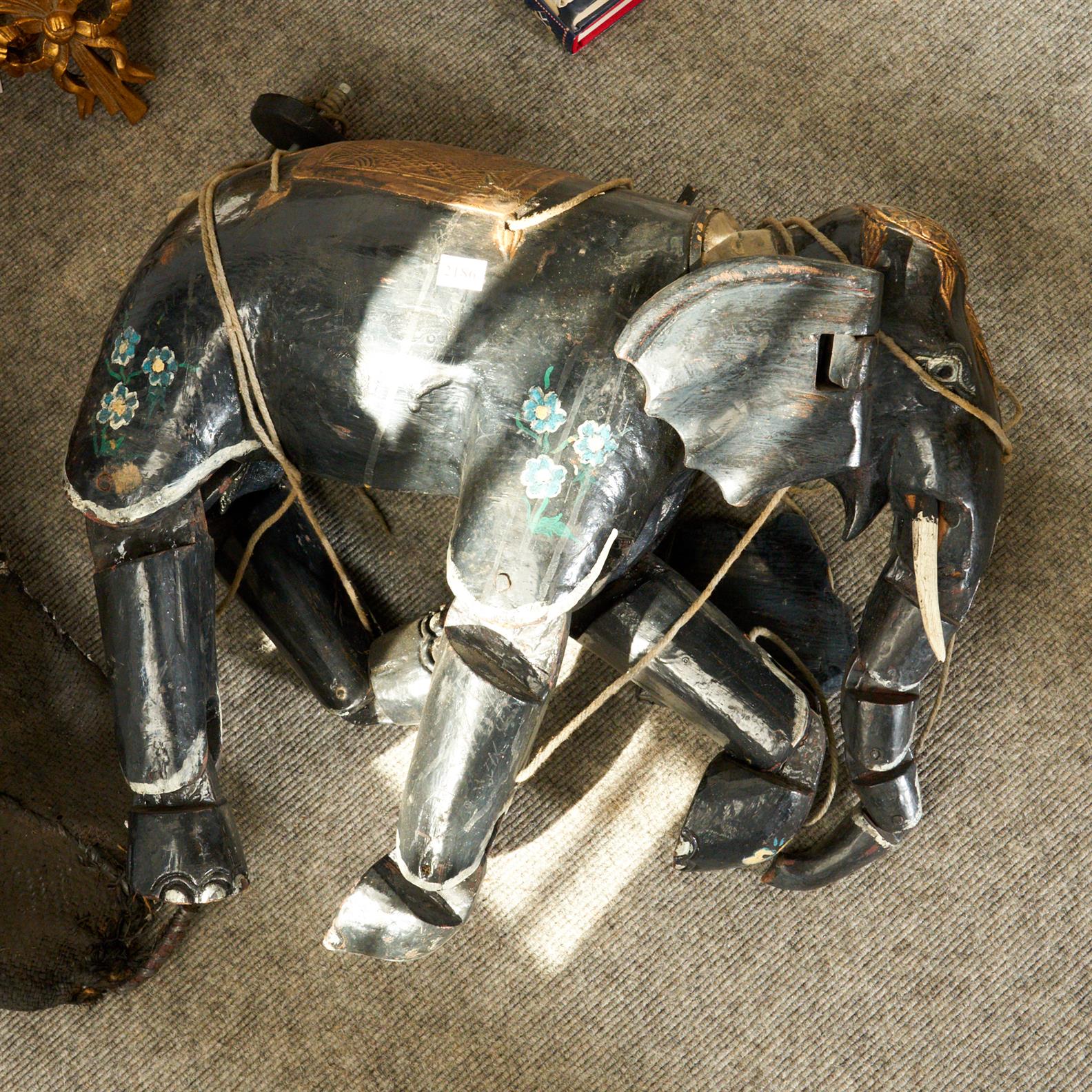 A LARGE VINTAGE ELEPHANT MARIONETTE (A/F) W.55CM