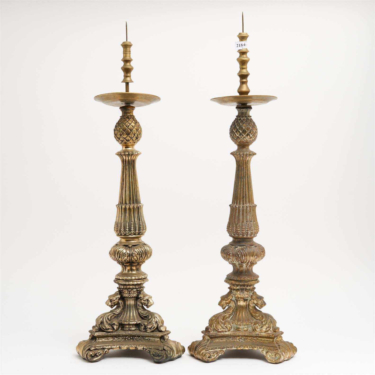 A PAIR OF TALL CAST METAL PRICKETT CANDLESTICKS (A/F) H.73CM