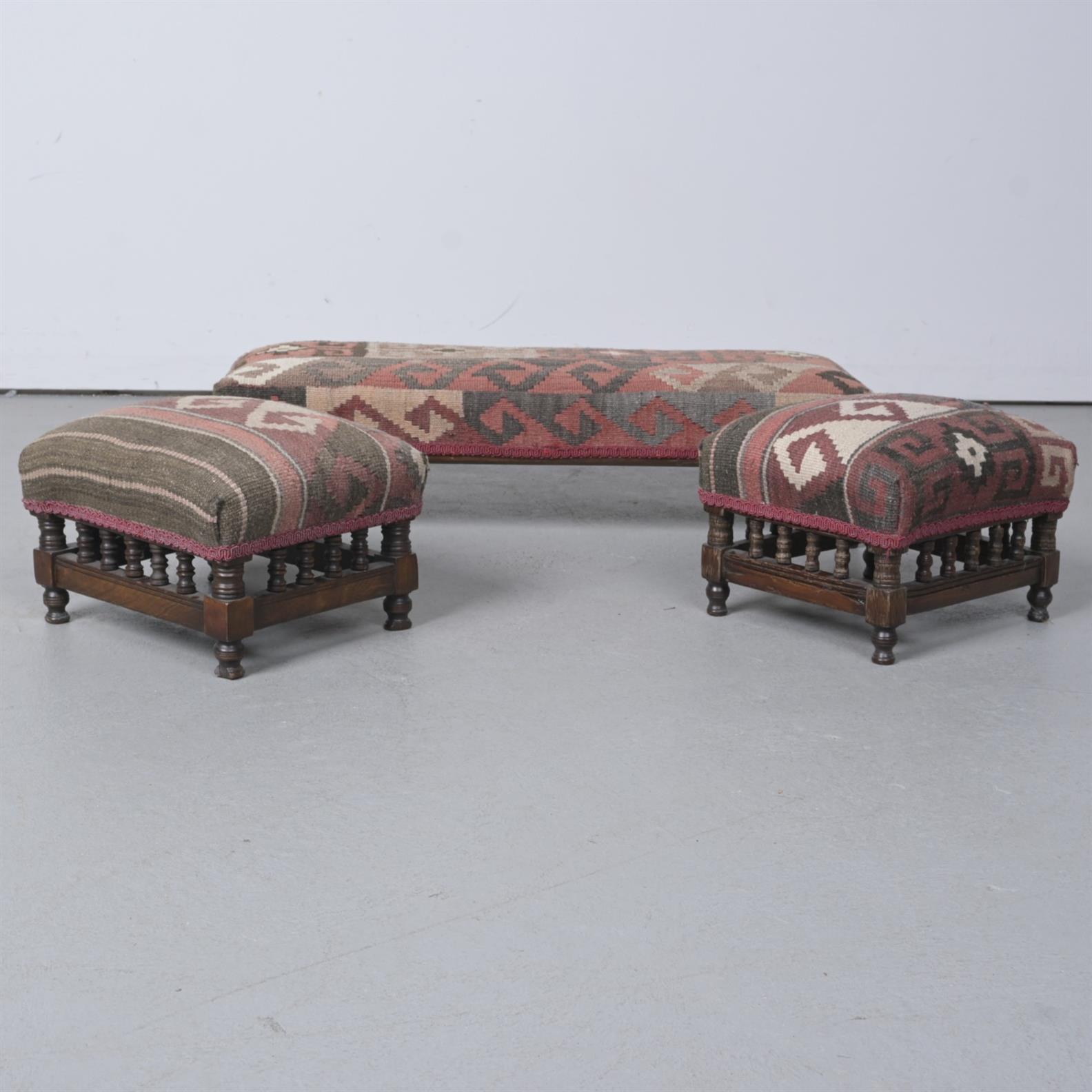 A GROUP OF THREE UPHOLSTERED STOOLS (20H X 79W X 32D CM, LARGEST)