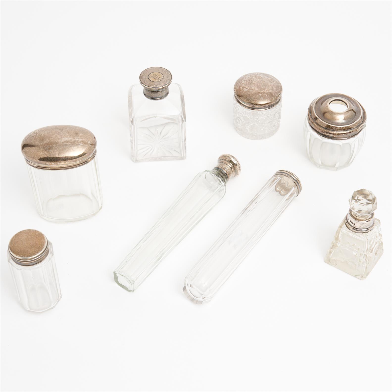 A GROUP OF STERLING SILVER MOUNTED DRESSING TABLE BOTTLES AND PERFUMES (SOME A/F) L.19CM (LONGEST)