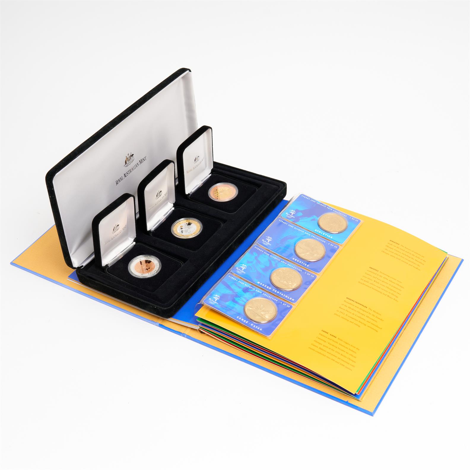 A COLLECTION OF AUSTRALIAN MEMORABILIA INCLUDING THREE AUSTRALIAN ROYAL MINT MILLENIUM COINS IN ORIGINAL CASES, A SYDNEY 2000 OLYMPIC COIN COLLECTION, SIR DONALD BRADMAN COINS AND STAMPS, AND CAPTAIN COOK BICENTENARY STAMP