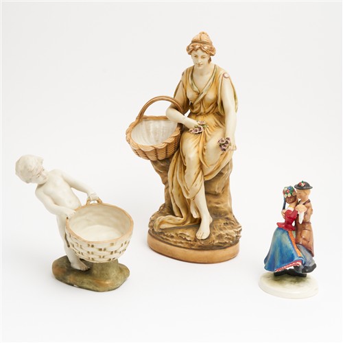 A GROUP OF CONTINENTAL AMPHORA PORCELAIN INCLUDING A LARGE MAIDEN WITH BASKET, A W GOEBEL DANCING COUPLE AND A FIGURAL BOWL H.42CM (TALLEST)