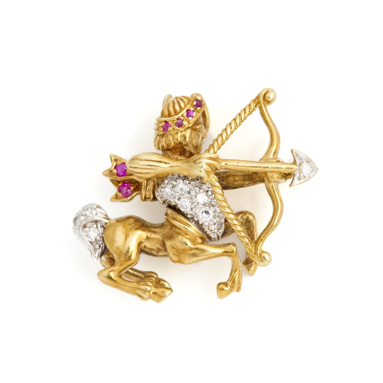 A RUBY AND DIAMOND SAGITTARIUS PENDANT/BROOCH IN 18CT TWO-TONE GOLD, 20 X 30MM, 7.6GMS