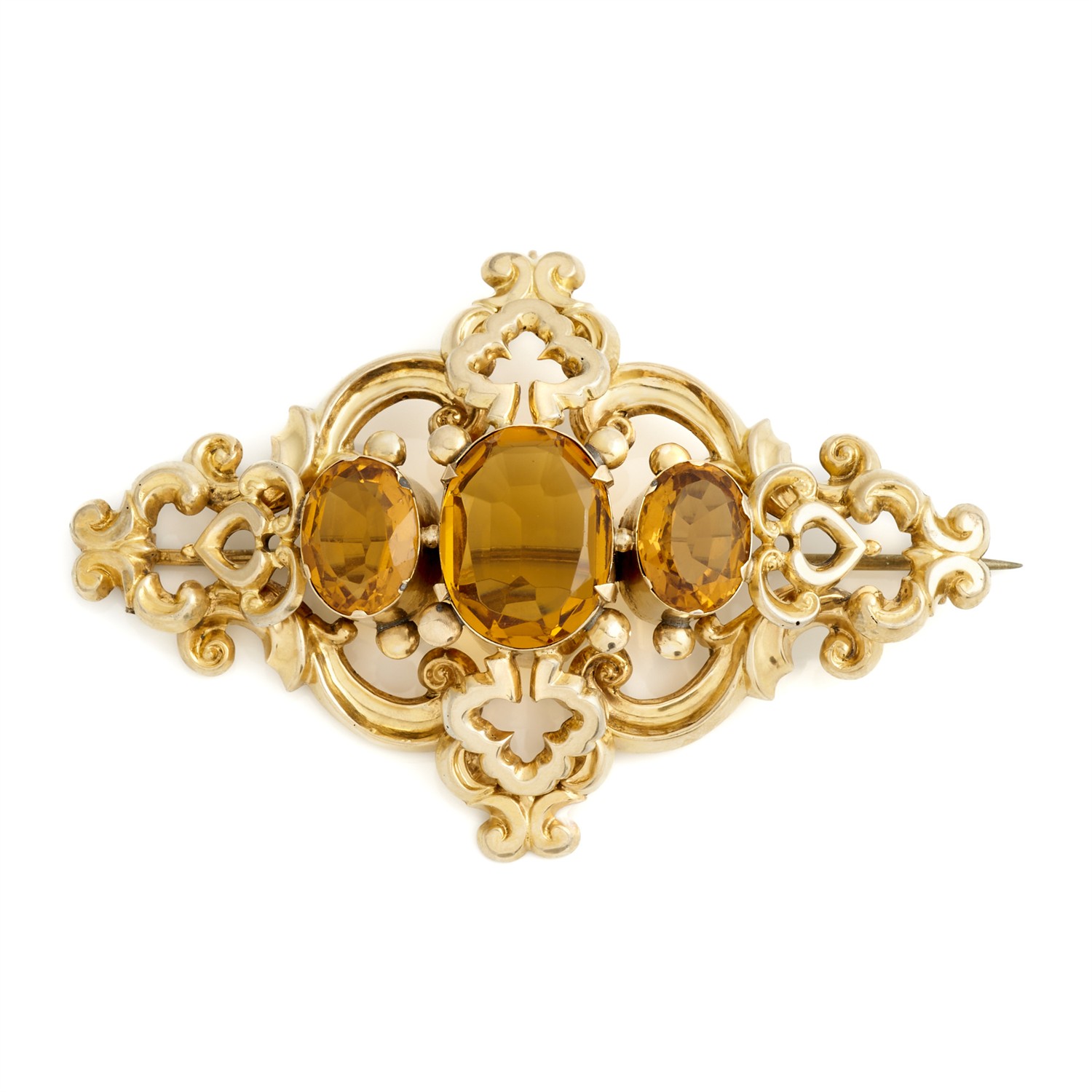 A LARGE ANTIQUE CITRINE BROOCH IN SILVER GILT, 73 X 50MM, 23.4GMS