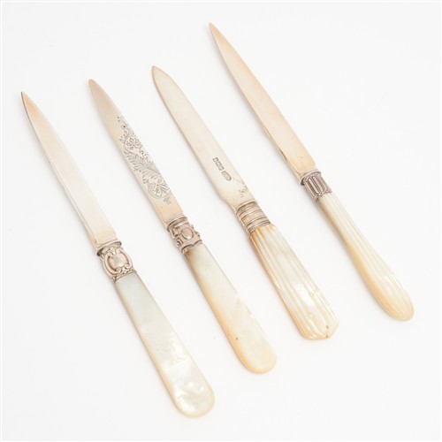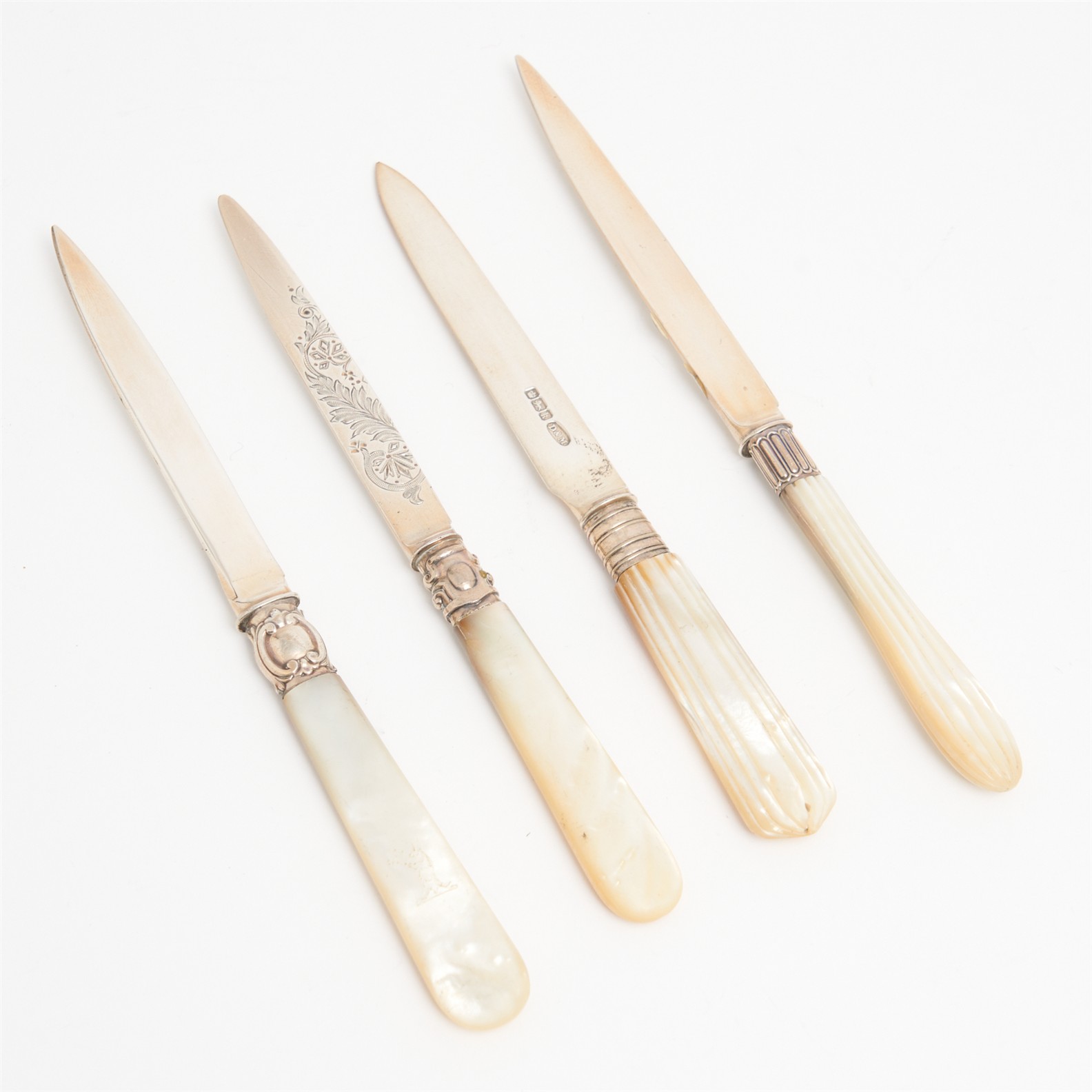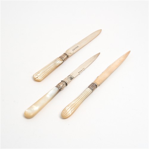 A COLLECTION OF THREE VICTORIAN STERLING SILVER LETTER OPENERS WITH CARVED MOTHER-OF-PEARL HANDLES L.19CM